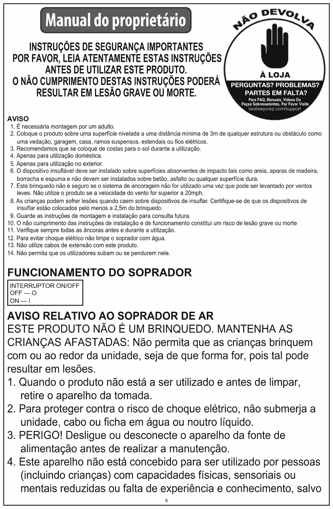 PERGUNTAS? PROBLEMAS? PARTES EM FALTA? Para FAQ, Manuais, Vídeos Ou Peças Sobresselentes, Por Favor Visitebestwaycorp.com/support À LOJA Manual do proprietárioAVISO RELATIVO AO SOPRADOR DE AR ESTE PRODUTO NÃO É UM BRINQUEDO. MANTENHA AS CRIANÇAS AFASTADAS: Não permita que as crianças brinquem com ou ao redor da unidade, seja de que forma for, pois tal pode resultar em lesões.