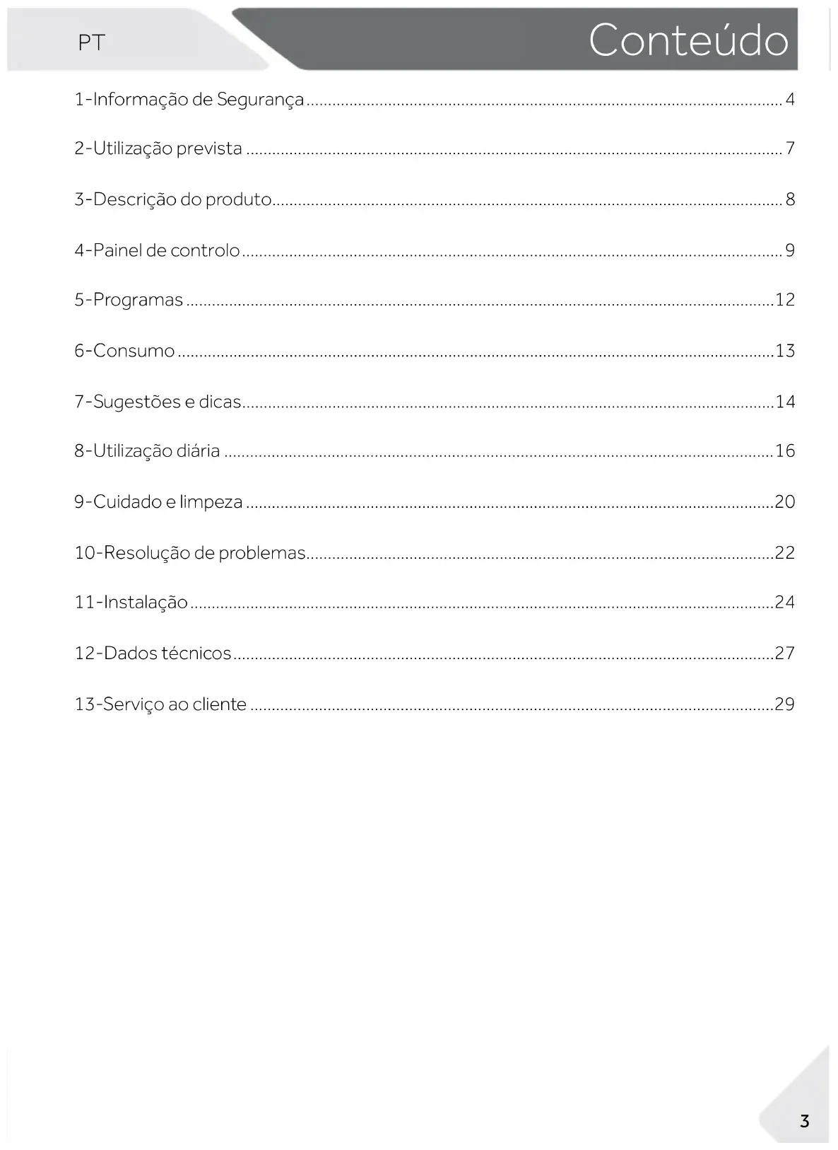 Eliminação Ajude a proteger o ambiente e a saúde humana. Pôr a embalagem em contentores adequados para ser reci- clada. Ajude a reciclar resíduos de aparelhos elétricos e eletrónicos. Não eliminar aparelhos marcados com este símbolo com o lixo doméstico. Levar o produto para a sua instalação de reciclagem local ou contactar o seu serviço municipal. ADVERTÊNCIA! Risco de lesão ou asxia! Desligar o aparelho da corrente elétrica. Cortar os cabos de alimentação e eliminá-los. Retirar a pega da porta para evitar que crianças e animais quem perto do aparelho. ADVERTÊNCIA! O aparelho não deve ser fornecido com um dispositivo externo de comutação, como um tem- porizador ou ligado a um circuito que seja regularmente ligado e desligado por um serviço. Legenda ADVERTÊNCIA! - Informação importante de segu- rança Informação e dicas gerais Informação ambiental Obrigado por comprar um produto Haier. Deve ler estas instruções cuidadosamente antes de usar o aparelho. As instruções con- tém informação importante que o ajudará a obter o melhor do aparelho e assegurar a ins- talação segura, utilização e manutenção adequada. Manter este manual em local conveniente para que o possa consultar sempre para a utili- zação segura e adequada do aparelho. Se vender o aparelho, o oferecer, ou o deixar quando mudar de casa, ter certeza de tam- bém entregar este manual para o novo proprietário se familiarizar com o aparelho e as advertências de segurança.PT Conteúdo