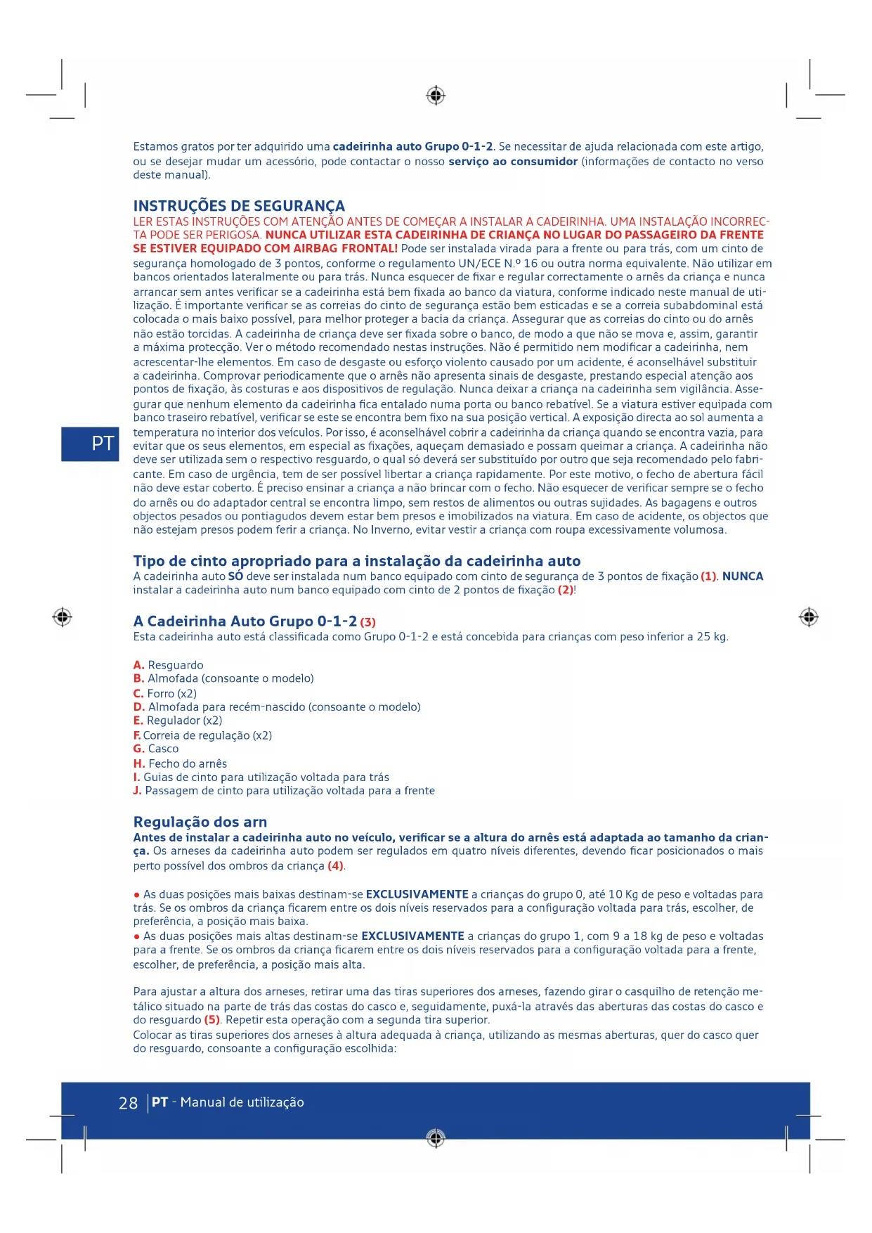 LER ESTAS INSTRUÇÕES COM ATENÇÃO ANTES DE COMEÇAR A INSTALAR A CADEIRINHA. UMA INSTALAÇÃO INCORREC- TA PODE SER PERIGOSA. NUNCA UTILIZAR ESTA CADEIRINHA DE CRIANÇA NO LUGAR DO PASSAGEIRO DA FRENTE SE ESTIVER EQUIPADO COM AIRBAG FRONTAL! Pode ser instalada virada para a frente ou para trás, com um cinto de segurança homologado de 3 pontos, conforme o regulamento UN/ECE N.° 16 ou outra norma equivalente. Não utilizar em bancos orientados lateralmente ou para trás. Nunca esquecer de fixar e regular correctamente o arnês da criança e nunca arrancar sem antes verificar se a cadeirinha está bem fixada ao banco da viatura, conforme indicado neste manual de uti- lização. É importante verificar se as correias do cinto de segurança estão bem esticadas e se a correia subabdominal está colocada o mais baixo possível, para melhor proteger a bacia da criança. Assegurar que as correias do cinto ou do arnês não estão torcidas. A cadeirinha de criança deve ser fixada sobre o banco, de modo a que não se mova e, assim, garantir a máxima protecção. Ver o método recomendado nestas instruções. Não é permitido nem modificar a cadeirinha, nem acrescentar-lhe elementos. Em caso de desgaste ou esforço violento causado por um acidente, é aconselhável substituir a cadeirinha. Comprovar periodicamente que o arnês não apresenta sinais de desgaste, prestando especial atenção aos pontos de fixação, às costuras e aos dispositivos de regulação. Nunca deixar a criança na cadeirinha sem vigilância. Asse- gurar que nenhum elemento da cadeirinha fica entalado numa porta ou banco rebatível. Se a viatura estiver equipada com banco traseiro rebatível, verificar se este se encontra bem fixo na sua posição vertical. A exposição directa ao sol aumenta a temperatura no interior dos veículos. Por isso, é aconselhável cobrir a cadeirinha da criança quando se encontra vazia, para evitar que os seus elementos, em especial as fixações, aqueçam demasiado e possam queimar a criança. A cadeirinha não deve ser utilizada sem o respectivo resguardo, o qual só deverá ser substituído por outro que seja recomendado pelo fabri- cante. Em caso de urgência, tem de ser possível libertar a criança rapidamente. Por este motivo, o fecho de abertura fácil não deve estar coberto. É preciso ensinar a criança a não brincar com o fecho. Não esquecer de verificar sempre se o fecho do arnês ou do adaptador central se encontra limpo, sem restos de alimentos ou outras sujidades. As bagagens e outros objectos pesados ou pontiagudos devem estar bem presos e imobilizados na viatura. Em caso de acidente, os objectos que não estejam presos podem ferir a criança. No Inverno, evitar vestir a criança com roupa excessivamente volumosa. Tipo de cinto apropriado para a instalação da cadeirinha auto A cadeirinha auto SÓ deve ser instalada num banco equipado com cinto de segurança de 3 pontos de fixação (1). NUNCA instalar a cadeirinha auto num banco equipado com cinto de 2 pontos de fixação (2)! A Cadeirinha Auto Grupo 0-1-2 (3) Esta cadeirinha auto está classificada como Grupo 0-1-2 e está concebida para crianças com peso inferior a 25 kg. A. Resguardo B. Almofada (consoante o modelo) C. Forro (x2) D. Almofada para recém-nascido (consoante o modelo) E. Regulador (x2) F. Correia de regulação (x2) G. Casco H. Fecho do arnês