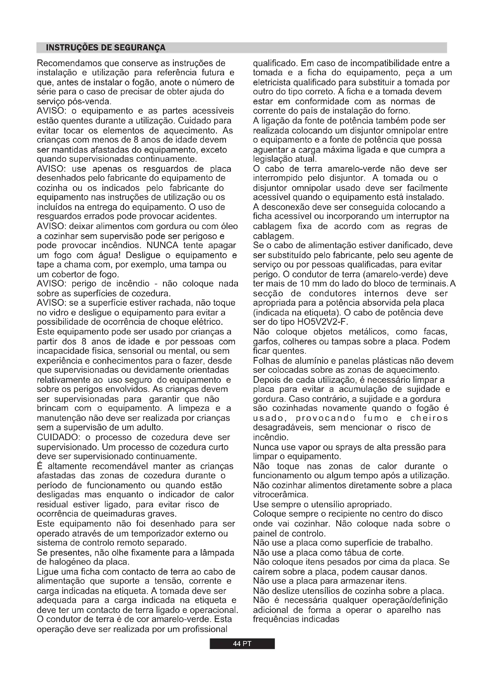 7,7 kW 734 l/h 560 g/h -44 PT CUIDADO: o processo de cozedura deve ser supervisionado. Um processo de cozedura curto deve ser supervisionado continuamente. Este equipamento não foi desenhado para ser operado através de um temporizador externo ou sistema de controlo remoto separado. É altamente recomendável manter as crianças afastadas das zonas de cozedura durante o período de funcionamento ou quando estão desligadas mas enquanto o indicador de calor residual estiver ligado, para evitar risco de ocorrência de queimaduras graves. Recomendamos que conserve as instruções de instalação e utilização para referência futura e que, antes de instalar o fogão, anote o número de série para o caso de precisar de obter ajuda do serviço pós-venda. AVISO: se a superfície estiver rachada, não toque no vidro e desligue o equipamento para evitar a possibilidade de ocorrência de choque elétrico. Ligue uma ficha com contacto de terra ao cabo de alimentação que suporte a tensão, corrente e carga indicadas na etiqueta. A tomada deve ser adequada para a carga indicada na etiqueta e deve ter um contacto de terra ligado e operacional. O condutor de terra é de cor amarelo-verde. Esta operação deve ser realizada por um profissional Este equipamento pode ser usado por crianças a partir dos 8 anos de idade e por pessoas com incapacidade física, sensorial ou mental, ou sem experiência e conhecimentos para o fazer, desde que supervisionadas ou devidamente orientadas relativamente ao uso seguro do equipamento e sobre os perigos envolvidos. As crianças devem ser supervisionadas para garantir que não brincam com o equipamento. A limpeza e a manutenção não deve ser realizada por crianças sem a supervisão de um adulto. Se presentes, não olhe fixamente para a lâmpada de halogéneo da placa. AVISO: perigo de incêndio - não coloque nada sobre as superfícies de cozedura. AVISO: o equipamento e as partes acessíveis estão quentes durante a utilização. Cuidado para evitar tocar os elementos de aquecimento. As crianças com menos de 8 anos de idade devem ser mantidas afastadas do equipamento, exceto quando supervisionadas continuamente. AVISO: use apenas os resguardos de placa desenhados pelo fabricante do equipamento de cozinha ou os indicados pelo fabricante do equipamento nas instruções de utilização ou os incluídos na entrega do equipamento. O uso de resguardos errados pode provocar acidentes. AVISO: deixar alimentos com gordura ou com óleo a cozinhar sem supervisão pode ser perigoso e pode provocar incêndios. NUNCA tente apagar um fogo com água! Desligue o equipamento e tape a chama com, por exemplo, uma tampa ou um cobertor de fogo.