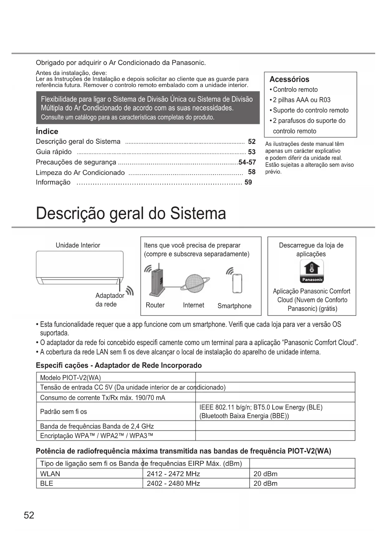 A cobertura da rede LAN sem fi os deve alcançar o local de instalação do aparelho de unidade interna. Panasonic Descarregue da loja de aplicações Router Internet Smartphone Itens que você precisa de preparar (compre e subscreva separadamente) Aplicação Panasonic Comfort Cloud (Nuvem de Conforto Panasonic) (grátis) Unidade Interior Adaptador da rede Modelo PIOT-V2(WA) Tensão de entrada CC 5V (Da unidade interior de ar condicionado) Consumo de corrente Tx/Rx máx. 190/70 mA Padrão sem fi os IEEE 802.11 b/g/n; BT5.0 Low Energy (BLE) (Bluetooth Baixa Energia (BBE)) Banda de frequências Banda de 2,4 GHz Encriptação WPA™ / WPA2™ / WPA3™ Especifi cações - Adaptador de Rede Incorporado Potência de radiofrequência máxima transmitida nas bandas de frequência PIOT-V2(WA) Tipo de ligação sem fi os Banda de frequências EIRP Máx. (dBm) WLAN 2412 - 2472 MHz 20 dBm BLE 2402 - 2480 MHz 20 dBm53