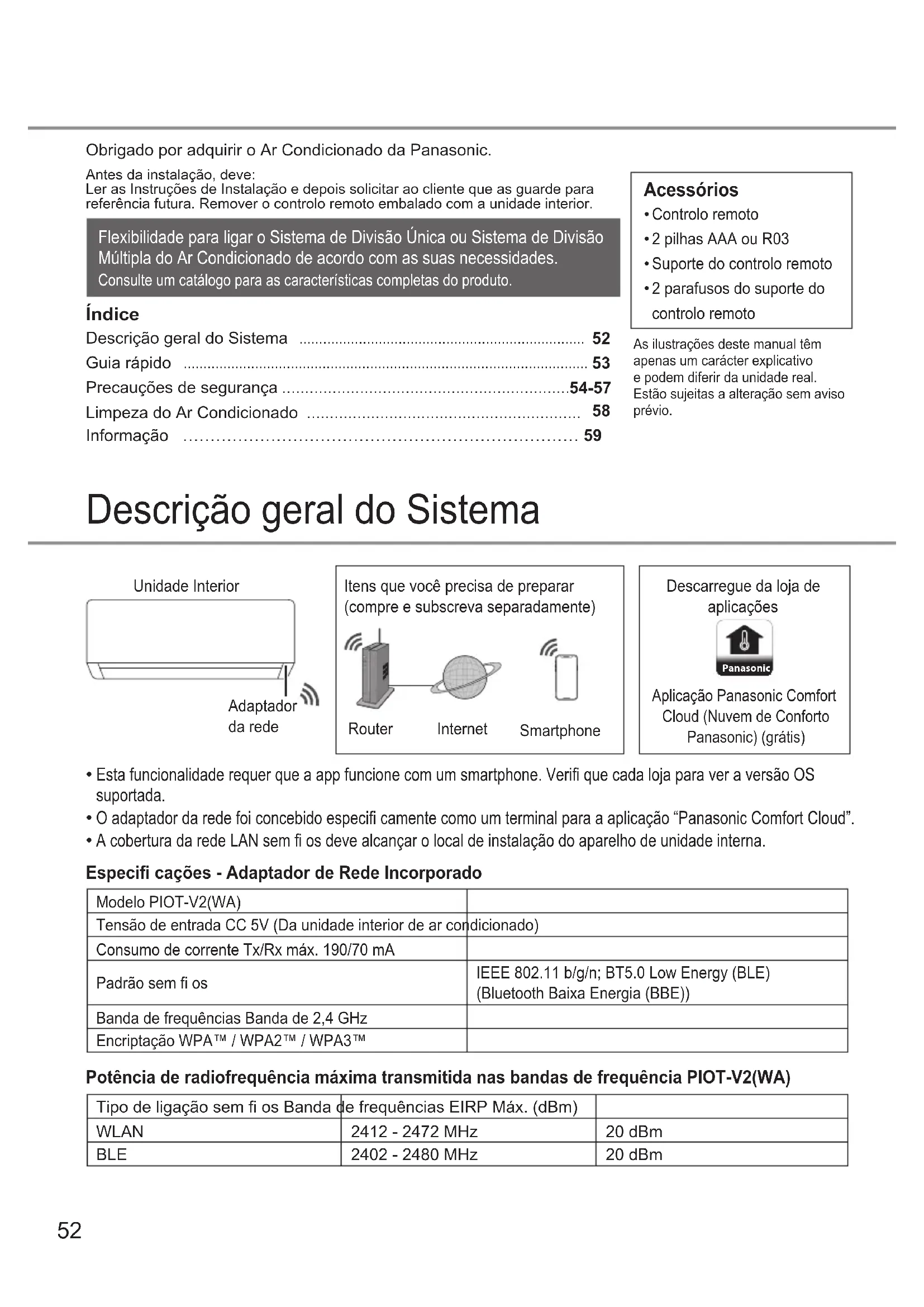 A cobertura da rede LAN sem fi os deve alcançar o local de instalação do aparelho de unidade interna. Panasonic Descarregue da loja de aplicações Router Internet Smartphone Itens que você precisa de preparar (compre e subscreva separadamente) Aplicação Panasonic Comfort Cloud (Nuvem de Conforto Panasonic) (grátis) Unidade Interior Adaptador da rede Modelo PIOT-V2(WA) Tensão de entrada CC 5V (Da unidade interior de ar condicionado) Consumo de corrente Tx/Rx máx. 190/70 mA Padrão sem fi os IEEE 802.11 b/g/n; BT5.0 Low Energy (BLE) (Bluetooth Baixa Energia (BBE)) Banda de frequências Banda de 2,4 GHz Encriptação WPA™ / WPA2™ / WPA3™ Especifi cações - Adaptador de Rede Incorporado Potência de radiofrequência máxima transmitida nas bandas de frequência PIOT-V2(WA) Tipo de ligação sem fi os Banda de frequências EIRP Máx. (dBm) WLAN 2412 - 2472 MHz 20 dBm BLE 2402 - 2480 MHz 20 dBm53