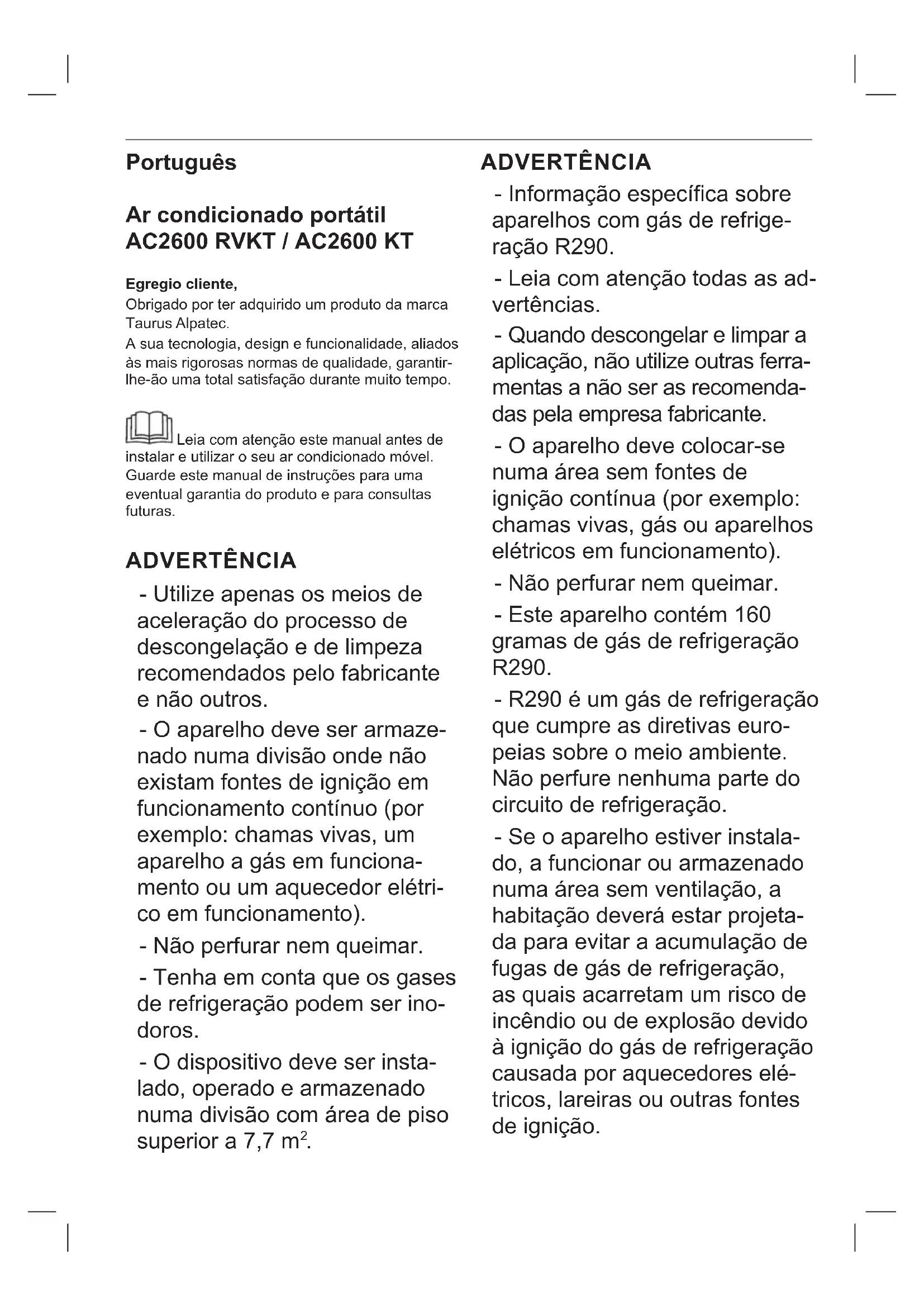 Egregio cliente, Obrigado por ter adquirido um produto da marca Taurus Alpatec. A sua tecnologia, design e funcionalidade, aliados às mais rigorosas normas de qualidade, garantir- lhe-ão uma total satisfação durante muito tempo. Leia com atenção este manual antes de instalar e utilizar o seu ar condicionado móvel. Guarde este manual de instruções para uma eventual garantia do produto e para consultas futuras. ADVERTÊNCIA - Utilize apenas os meios de aceleração do processo de descongelação e de limpeza recomendados pelo fabricante e não outros. - O aparelho deve ser armaze- nado numa divisão onde não existam fontes de ignição em funcionamento contínuo (por exemplo: chamas vivas, um aparelho a gás em funciona- mento ou um aquecedor elétri- co em funcionamento). - Não perfurar nem queimar. - Tenha em conta que os gases de refrigeração podem ser ino- doros. - O dispositivo deve ser insta- lado, operado e armazenado numa divisão com área de piso superior a 7,7 m