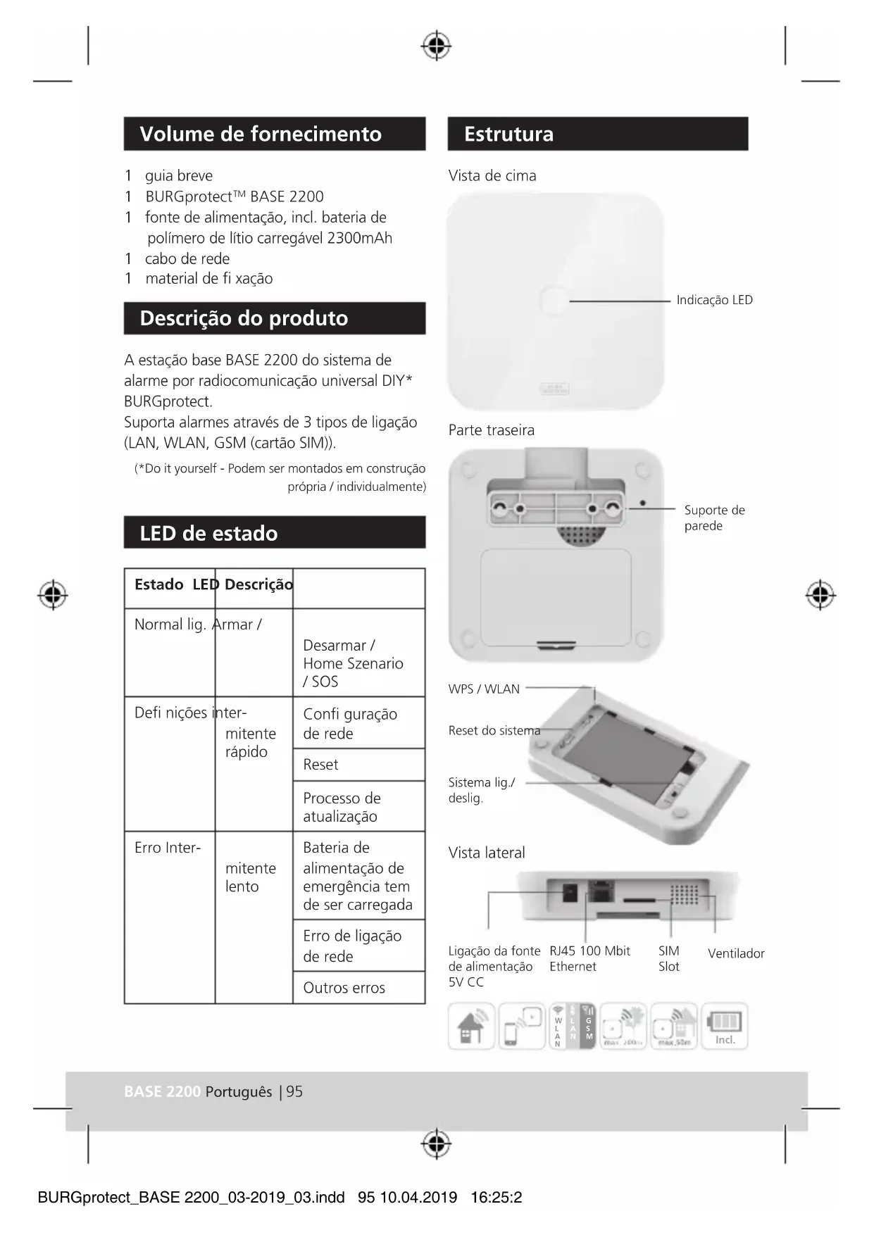 BASE 2200 1 fonte de alimentação, incl. bateria de polímero de lítio carregável 2300mAh 1 cabo de rede 1 material de xação Volume de fornecimento BA BURGprotect_BASE 2200_03-2019_03.indd 95 10.04.2019 16:25:21BASE 2200 96 | Português