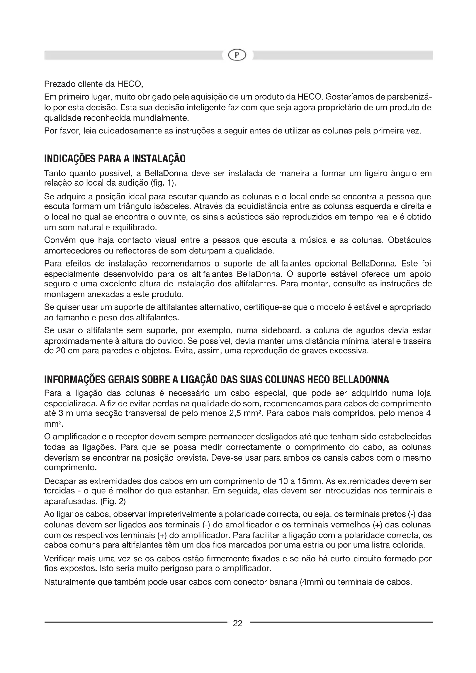 BellaDonna Conguración: Reejo bajo de 2 vías Resistencia: 150 / 250 vatios Impedancia: 4 – 8 ohmios Gama de frecuencias: 28 – 52 000 Hz Potencia recomendada del amplicador: 30 – 250 vatios Rendimiento (1 vatio/1 m): 91 dB Dimensiones (an x al x pr): 276 x 450 x 462 mm Accesorios: Puntas de metal RESERVADOS LOS DERECHOS DE REALIZAR CAMBIOS TÉCNICOS.22 Prezado cliente da HECO, Em primeiro lugar, muito obrigado pela aquisição de um produto da HECO. Gostaríamos de parabenizá- lo por esta decisão. Esta sua decisão inteligente faz com que seja agora proprietário de um produto de qualidade reconhecida mundialmente. Por favor, leia cuidadosamente as instruções a seguir antes de utilizar as colunas pela primeira vez.