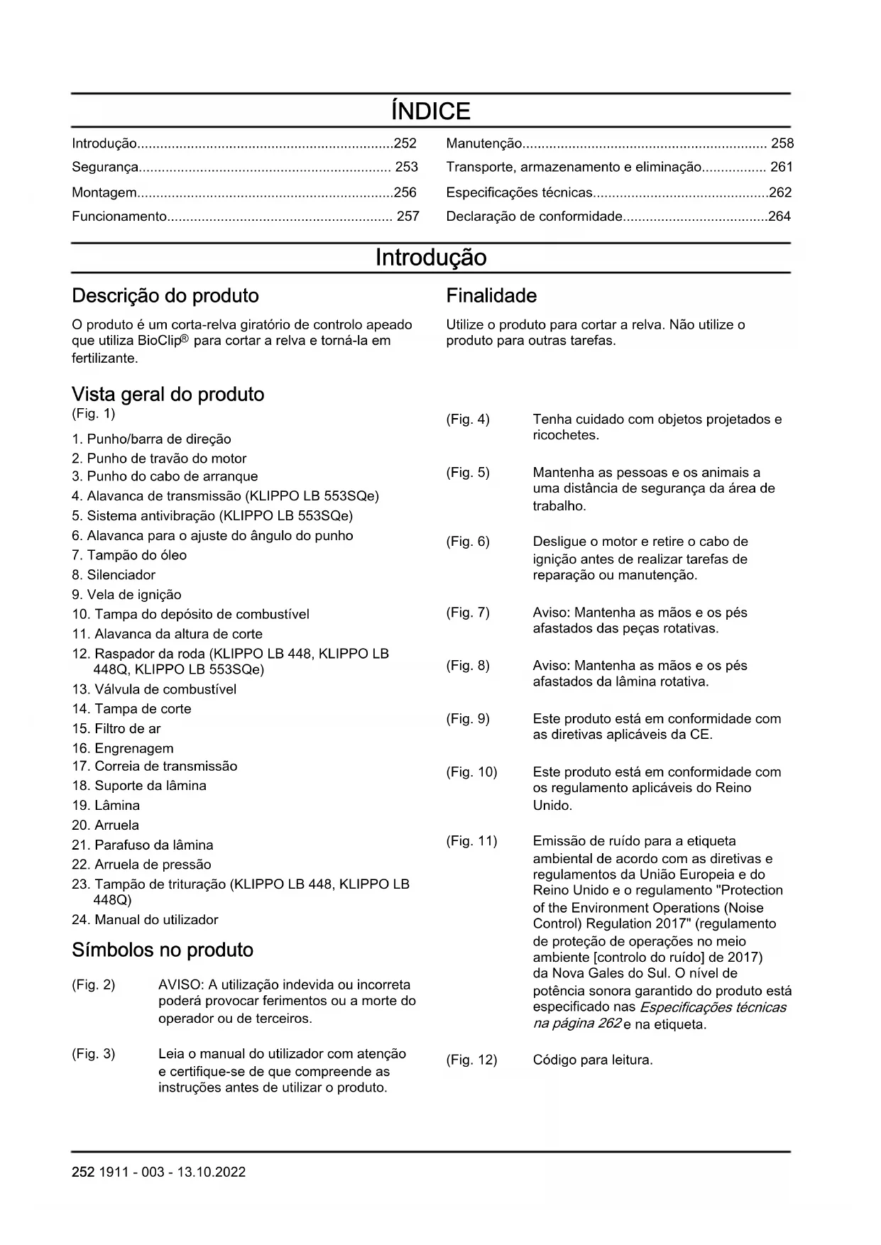Símbolos no produto (Fig. 2) AVISO: A utilização indevida ou incorreta poderá provocar ferimentos ou a morte do operador ou de terceiros. (Fig. 3) Leia o manual do utilizador com atenção e certifique-se de que compreende as instruções antes de utilizar o produto. (Fig. 4) Tenha cuidado com objetos projetados e ricochetes. (Fig. 5) Mantenha as pessoas e os animais a uma distância de segurança da área de trabalho. (Fig. 6) Desligue o motor e retire o cabo de ignição antes de realizar tarefas de reparação ou manutenção. (Fig. 7) Aviso: Mantenha as mãos e os pés afastados das peças rotativas. (Fig. 8) Aviso: Mantenha as mãos e os pés afastados da lâmina rotativa. (Fig. 9) Este produto está em conformidade com as diretivas aplicáveis da CE. (Fig. 10) Este produto está em conformidade com os regulamento aplicáveis do Reino Unido. (Fig. 11) Emissão de ruído para a etiqueta ambiental de acordo com as diretivas e regulamentos da União Europeia e do Reino Unido e o regulamento "Protection of the Environment Operations (Noise Control) Regulation 2017" (regulamento de proteção de operações no meio ambiente [controlo do ruído] de 2017) da Nova Gales do Sul. O nível de potência sonora garantido do produto está especificado nas Especificações técnicas na página 262 e na etiqueta. (Fig. 12) Código para leitura. 252 1911 - 003 - 13.10.2022Nota: Os restantes símbolos/autocolantes no produto referem-se a requisitos legais específicos do mercado. Autocolante no produto, apenas para a Austrália e Nova Zelândia (Fig. 13) Mantenha as mãos e os pés afastados da lâmina rotativa. Emissões Euro V ATENÇÃO: A adulteração do motor anula a aprovação deste produto pela UE. Responsabilidade pelo produto Como referido nas leis de responsabilidade pelo produto, não somos responsáveis por danos causados pelo nosso produto se: