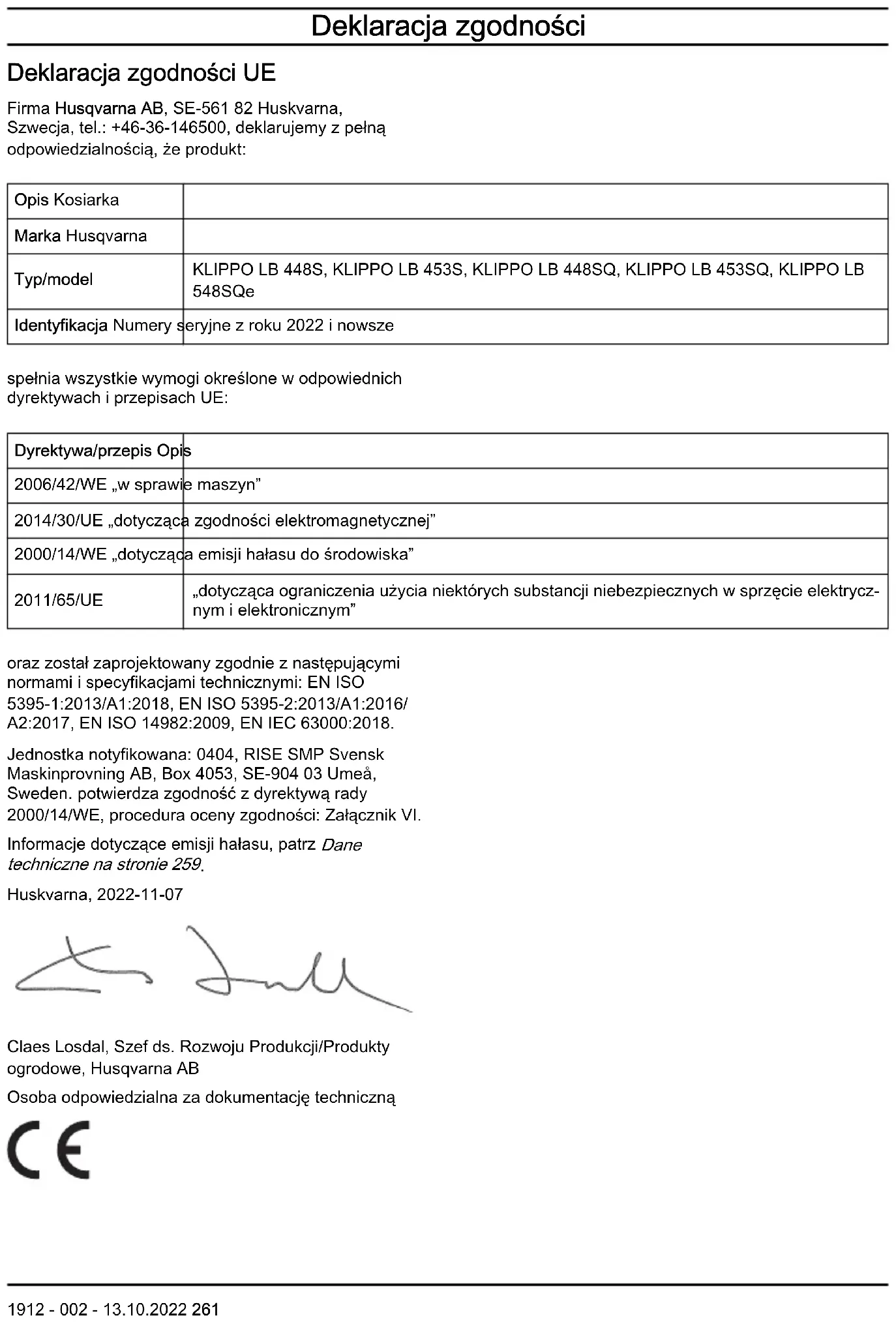 274 1912 - 002 - 13.10.2022Declaração de conformidade Declaração UE de conformidade A Husqvarna AB, SE‐561 82 Huskvarna, Suécia, tel.: +46-36-146500, declara, sob sua inteira responsabilidade, que o produto: Descrição Corta-relva Marca Husqvarna Tipo/Modelo KLIPPO LB 448S, KLIPPO LB 453S, KLIPPO LB 448SQ, KLIPPO LB 453SQ, KLIPPO LB 548SQe Identificação Números de série referentes a 2022 e posteriores está em plena conformidade com as seguintes diretivas e regulamentos da UE: Diretiva/Regulamen-