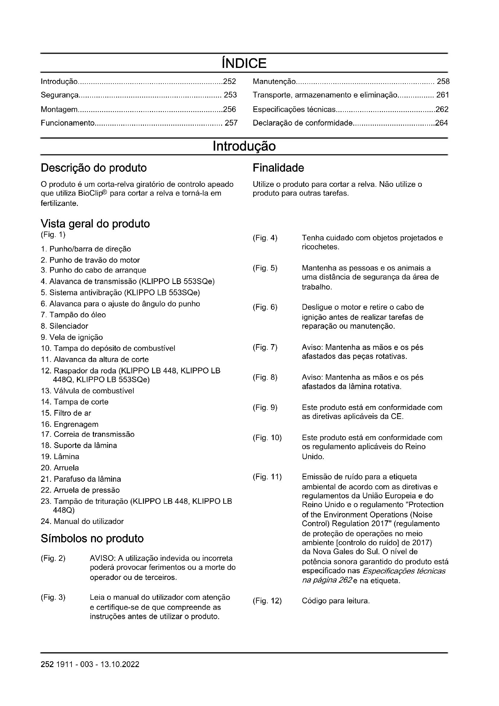Símbolos no produto (Fig. 2) AVISO: A utilização indevida ou incorreta poderá provocar ferimentos ou a morte do operador ou de terceiros. (Fig. 3) Leia o manual do utilizador com atenção e certifique-se de que compreende as instruções antes de utilizar o produto. (Fig. 4) Tenha cuidado com objetos projetados e ricochetes. (Fig. 5) Mantenha as pessoas e os animais a uma distância de segurança da área de trabalho. (Fig. 6) Desligue o motor e retire o cabo de ignição antes de realizar tarefas de reparação ou manutenção. (Fig. 7) Aviso: Mantenha as mãos e os pés afastados das peças rotativas. (Fig. 8) Aviso: Mantenha as mãos e os pés afastados da lâmina rotativa. (Fig. 9) Este produto está em conformidade com as diretivas aplicáveis da CE. (Fig. 10) Este produto está em conformidade com os regulamento aplicáveis do Reino Unido. (Fig. 11) Emissão de ruído para a etiqueta ambiental de acordo com as diretivas e regulamentos da União Europeia e do Reino Unido e o regulamento "Protection of the Environment Operations (Noise Control) Regulation 2017" (regulamento de proteção de operações no meio ambiente [controlo do ruído] de 2017) da Nova Gales do Sul. O nível de potência sonora garantido do produto está especificado nas Especificações técnicas na página 262 e na etiqueta. (Fig. 12) Código para leitura. 252 1911 - 003 - 13.10.2022Nota: Os restantes símbolos/autocolantes no produto referem-se a requisitos legais específicos do mercado. Autocolante no produto, apenas para a Austrália e Nova Zelândia (Fig. 13) Mantenha as mãos e os pés afastados da lâmina rotativa. Emissões Euro V ATENÇÃO: A adulteração do motor anula a aprovação deste produto pela UE. Responsabilidade pelo produto Como referido nas leis de responsabilidade pelo produto, não somos responsáveis por danos causados pelo nosso produto se: