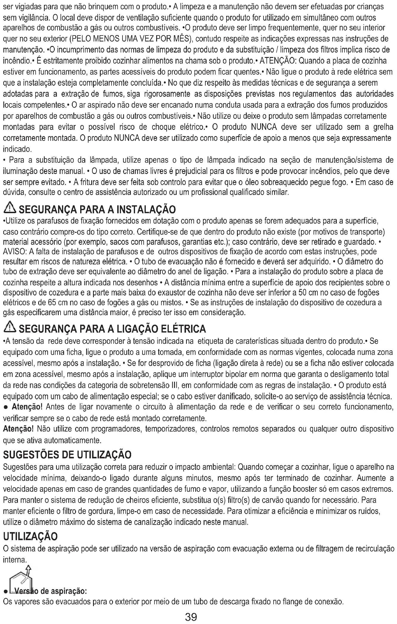 - Não faça alterações elétricas ou mecânicas no produto ou nas condutas de extração. •Antes de qualquer operação de limpeza ou de manutenção, desligue o produto da rede elétrica, retirando a ficha da tomada ou desligando o interruptor geral da habitação. •Para todas as operações de instalação e manutenção, use luvas de trabalho.• O produto pode ser utilizado por crianças de idade não inferior a 8 anos e por pessoas com capacidades físicas, sensoriais ou mentais reduzidas, ou com falta de experiência ou do necessário conhecimento, desde que sob vigilância ou após terem recebido instruções acerca do uso do aparelho em segurança e da compreensão dos perigos a ele inerentes.• As crianças devem 38ser vigiadas para que não brinquem com o produto.• A limpeza e a manutenção não devem ser efetuadas por crianças sem vigilância. O local deve dispor de ventilação suficiente quando o produto for utilizado em simultâneo com outros aparelhos de combustão a gás ou outros combustíveis. •O produto deve ser limpo frequentemente, quer no seu interior quer no seu exterior (PELO MENOS UMA VEZ POR MÊS), contudo respeite as indicações expressas nas instruções de manutenção. •O incumprimento das normas de limpeza do produto e da substituição / limpeza dos filtros implica risco de incêndio.• É estritamente proibido cozinhar alimentos na chama sob o produto.• ATENÇÃO: Quando a placa de cozinha estiver em funcionamento, as partes acessíveis do produto podem ficar quentes.• Não ligue o produto à rede elétrica sem que a instalação esteja completamente concluída.• No que diz respeito às medidas técnicas e de segurança a serem adotadas para a extração de fumos, siga rigorosamente as disposições previstas nos regulamentos das autoridades locais competentes.• O ar aspirado não deve ser encanado numa conduta usada para a extração dos fumos produzidos por aparelhos de combustão a gás ou outros combustíveis.• Não utilize ou deixe o produto sem lâmpadas corretamente montadas para evitar o possível risco de choque elétrico.• O produto NUNCA deve ser utilizado sem a grelha corretamente montada. O produto NUNCA deve ser utilizado como superfície de apoio a menos que seja expressamente indicado.