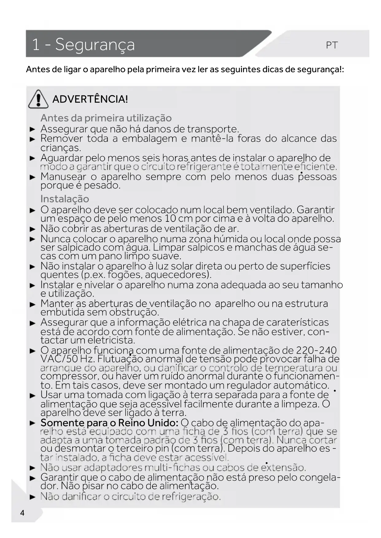 ADVERTÊNCIA! Antes da primeira utilização Assegurar que não há danos de transporte. Remover toda a embalagem e mantê-la foras do alcance das crianças. Aguardar pelo menos seis horas antes de instalar o aparelho de