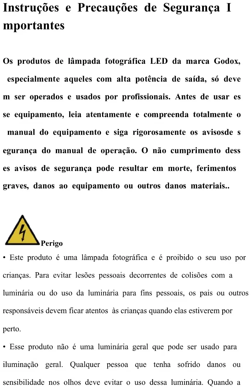Risco de luz IVAviso, superfície quente!Instruções e Precauções de Segurança I mportantes Os produtos de lâmpada fotográfica LED da marca Godox, especialmente aqueles com alta potência de saída, só deve m ser operados e usados por profissionais. Antes de usar es se equipamento, leia atentamente e compreenda totalmente o manual do equipamento e siga rigorosamente os avisosde s egurança do manual de operação. O não cumprimento dess es avisos de segurança pode resultar em morte, ferimentos graves, danos ao equipamento ou outros danos materiais.. Perigo