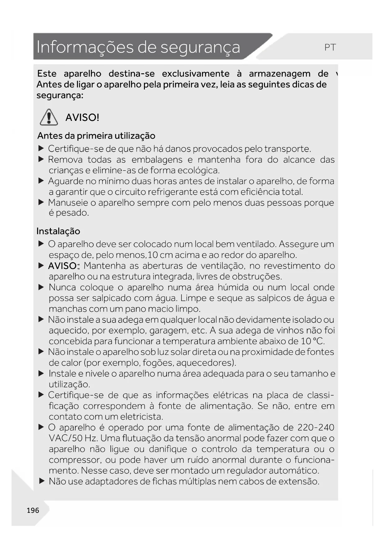 Instale e nivele o aparelho numa área adequada para o seu tamanho e utilização. f Certifique-se de que as informações elétricas na placa de classi- ficação correspondem à fonte de alimentação. Se não, entre em contato com um eletricista. f O aparelho é operado por uma fonte de alimentação de 220-240 VAC/50 Hz. Uma flutuação da tensão anormal pode fazer com que o aparelho não ligue ou danifique o controlo da temperatura ou o compressor, ou pode haver um ruído anormal durante o funciona- mento. Nesse caso, deve ser montado um regulador automático. f Não use adaptadores de fichas múltiplas nem cabos de extensão.PT Informações de segurança
