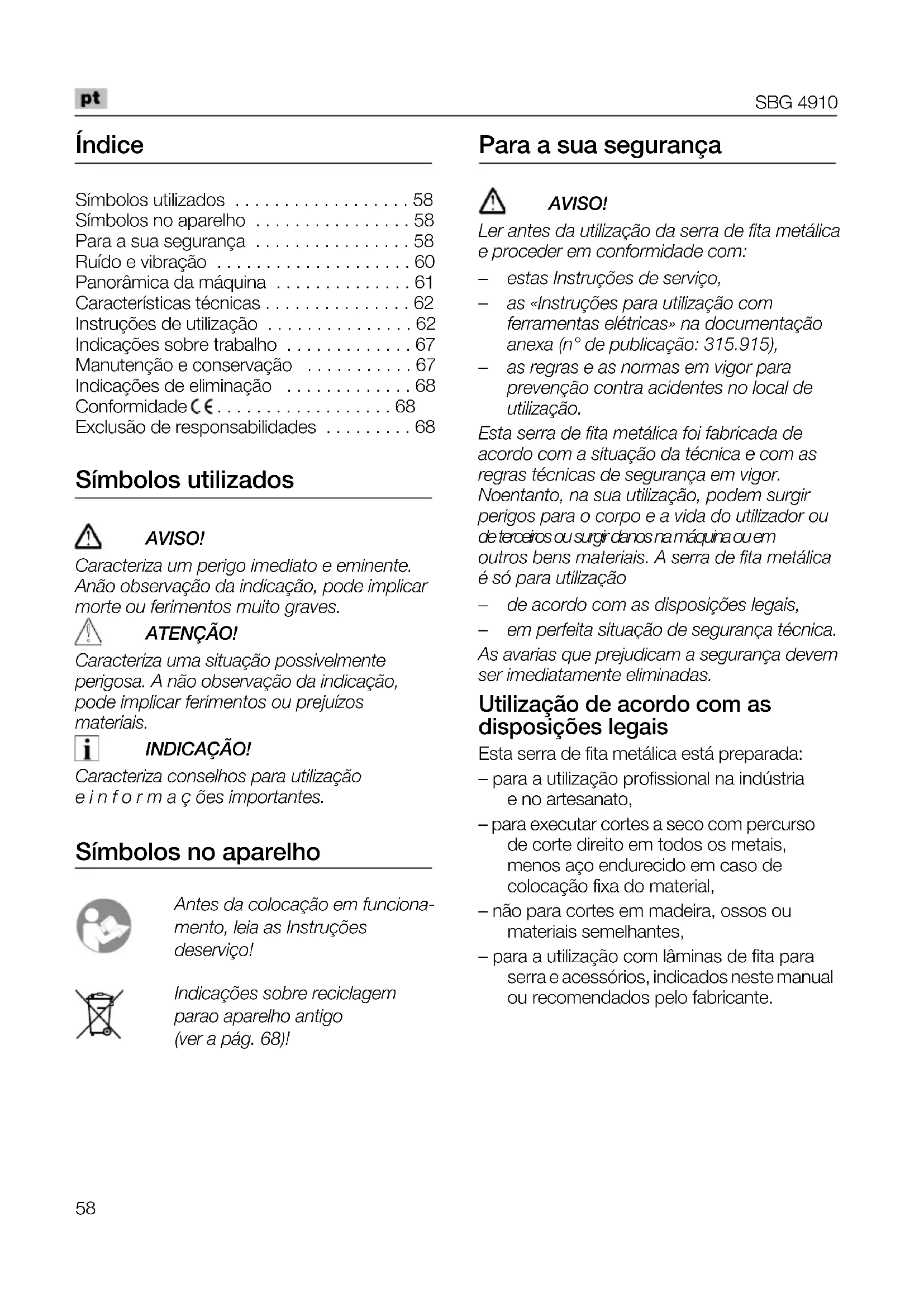Éã=éÉêÑÉáí~=ëáíì~´©ç=ÇÉ=ëÉÖìê~å´~=í¨ÅåáÅ~K= ^ë=~î~êá~ë=èìÉ=éêÉàìÇáÅ~ã=~= ëÉÖìê~å´~=ÇÉîÉã= ëÉê=áãÉÇá~í~ãÉåíÉ=Éäáãáå~Ç~ ëK Utilização de acordo com as disposições legais Esta serra de fita metálica está preparada: – para a utilização profissional na indústria e no artesanato, – para executar cortes a seco com percurso de corte direito em todos os metais, menos aço endurecido em caso de colocação fixa do material, – não para cortes em madeira, ossos ou materiais semelhantes, – para a utilização com lâminas de fita para serra e acessórios, indicados neste manual ou recomendados pelo fabricante.SBG 4910