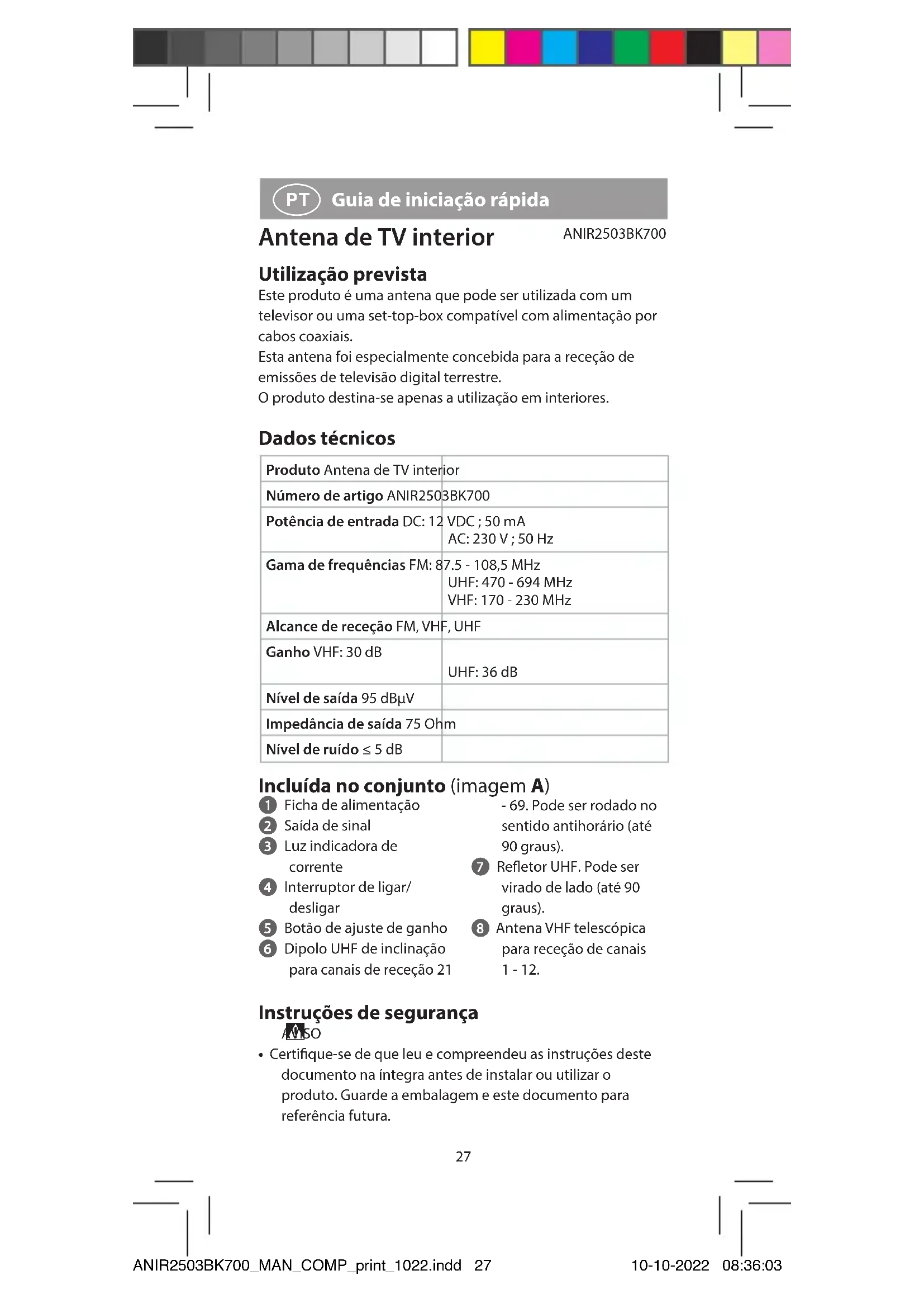 Guia de iniciação rápida Antena de TV interior ANIR2503BK700 Utilização prevista Este produto é uma antena que pode ser utilizada com um televisor ou uma set-top-box compatível com alimentação por cabos coaxiais.Esta antena foi especialmente concebida para a receção de emissões de televisão digital terrestre.O produto destina-se apenas a utilização em interiores. Dados técnicos Produto Antena de TV interiorNúmero de artigo ANIR2503BK700Potência de entrada DC: 12 VDC ; 50 mAAC: 230 V ; 50 HzGama de frequências FM: 87.5 - 108,5 MHzUHF: 470 - 694 MHzVHF: 170 - 230 MHzAlcance de receção FM, VHF, UHFGanho VHF: 30 dBUHF: 36 dBNível de saída 95 dBµVImpedância de saída 75 OhmNível de ruído ≤ 5 dB Incluída no conjunto (imagem A) 1 Ficha de alimentação 2 Saída de sinal 3 Luz indicadora de corrente 4 Interruptor de ligar/ desligar 5 Botão de ajuste de ganho 6 Dipolo UHF de inclinação para canais de receção 21 - 69. Pode ser rodado no sentido antihorário (até 90 graus). 7 Reetor UHF. Pode ser virado de lado (até 90 graus). 8 Antena VHF telescópica para receção de canais 1 - 12. Instruções de segurança