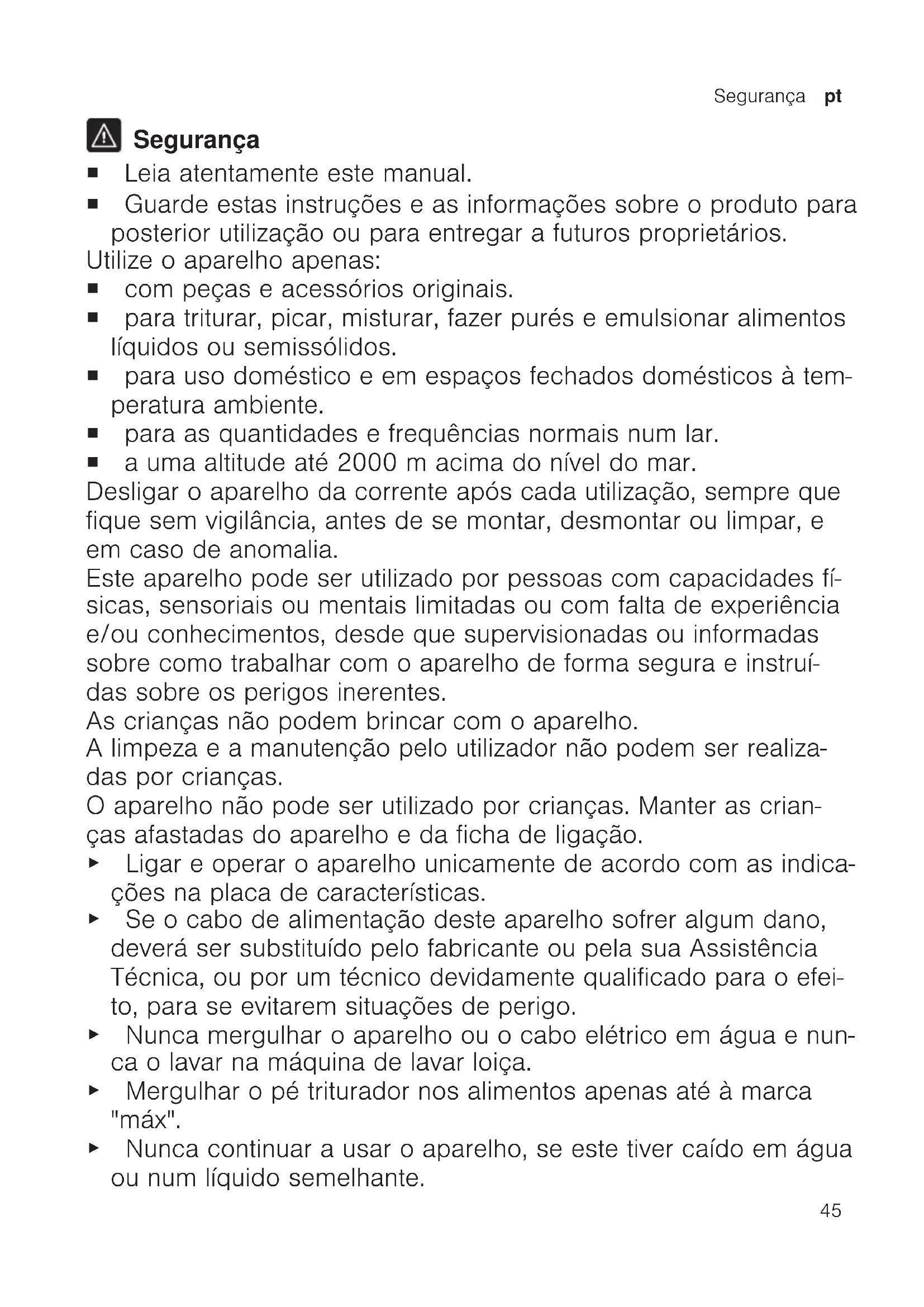 Segurança ¡ Leia atentamente este manual. ¡ Guarde estas instruções e as informações sobre o produto para posterior utilização ou para entregar a futuros proprietários. Utilize o aparelho apenas: ¡ com peças e acessórios originais. ¡ para triturar, picar, misturar, fazer purés e emulsionar alimentos líquidos ou semissólidos. ¡ para uso doméstico e em espaços fechados domésticos à tem- peratura ambiente. ¡ para as quantidades e frequências normais num lar. ¡ a uma altitude até 2000m acima do nível do mar. Desligar o aparelho da corrente após cada utilização, sempre que fique sem vigilância, antes de se montar, desmontar ou limpar, e em caso de anomalia. Este aparelho pode ser utilizado por pessoas com capacidades fí- sicas, sensoriais ou mentais limitadas ou com falta de experiência e/ou conhecimentos, desde que supervisionadas ou informadas sobre como trabalhar com o aparelho de forma segura e instruí- das sobre os perigos inerentes. As crianças não podem brincar com o aparelho. A limpeza e a manutenção pelo utilizador não podem ser realiza- das por crianças. O aparelho não pode ser utilizado por crianças. Manter as crian- ças afastadas do aparelho e da ficha de ligação. ▶ Ligar e operar o aparelho unicamente de acordo com as indica- ções na placa de características. ▶ Se o cabo de alimentação deste aparelho sofrer algum dano, deverá ser substituído pelo fabricante ou pela sua Assistência Técnica, ou por um técnico devidamente qualificado para o efei- to, para se evitarem situações de perigo. ▶ Nunca mergulhar o aparelho ou o cabo elétrico em água e nun- ca o lavar na máquina de lavar loiça. ▶ Mergulhar o pé triturador nos alimentos apenas até à marca "máx". ▶ Nunca continuar a usar o aparelho, se este tiver caído em água ou num líquido semelhante.pt Evitar danos materiais