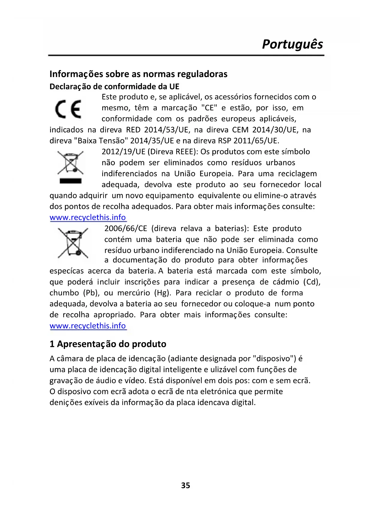 Informações sobre as normas reguladoras Declaração de conformidade da UE Este produto e, se aplicável, os acessórios fornecidos com o mesmo, têm a marcação "CE" e estão, por isso, em conformidade com os padrões europeus aplicáveis, indicados na diretiva RED 2014/53/UE, na diretiva CEM 2014/30/UE, na diretiva "Baixa Tensão" 2014/35/UE e na diretiva RSP 2011/65/UE. 2012/19/UE (Diretiva REEE): Os produtos com este símbolo não podem ser eliminados como resíduos urbanos indiferenciados na União Europeia. Para uma reciclagem adequada, devolva este produto ao seu fornecedor local quando adquirir um novo equipamento equivalente ou elimine-o através dos pontos de recolha adequados. Para obter mais informações consulte: www.recyclethis.info 2006/66/CE (diretiva relativa a baterias): Este produto contém uma bateria que não pode ser eliminada como resíduo urbano indiferenciado na União Europeia. Consulte a documentação do produto para obter informações específicas acerca da bateria. A bateria está marcada com este símbolo, que poderá incluir inscrições para indicar a presença de cádmio (Cd), chumbo (Pb), ou mercúrio (Hg). Para reciclar o produto de forma adequada, devolva a bateria ao seu fornecedor ou coloque-a num ponto de recolha apropriado. Para obter mais informações consulte: www.recyclethis.info 1 Apresentação do produto A câmara de placa de identificação (adiante designada por "dispositivo") é uma placa de identificação digital inteligente e utilizável com funções de gravação de áudio e vídeo. Está disponível em dois tipos: com e sem ecrã. O dispositivo com ecrã adota o ecrã de tinta eletrónica que permite definições flexíveis da informação da placa identificativa digital.Português