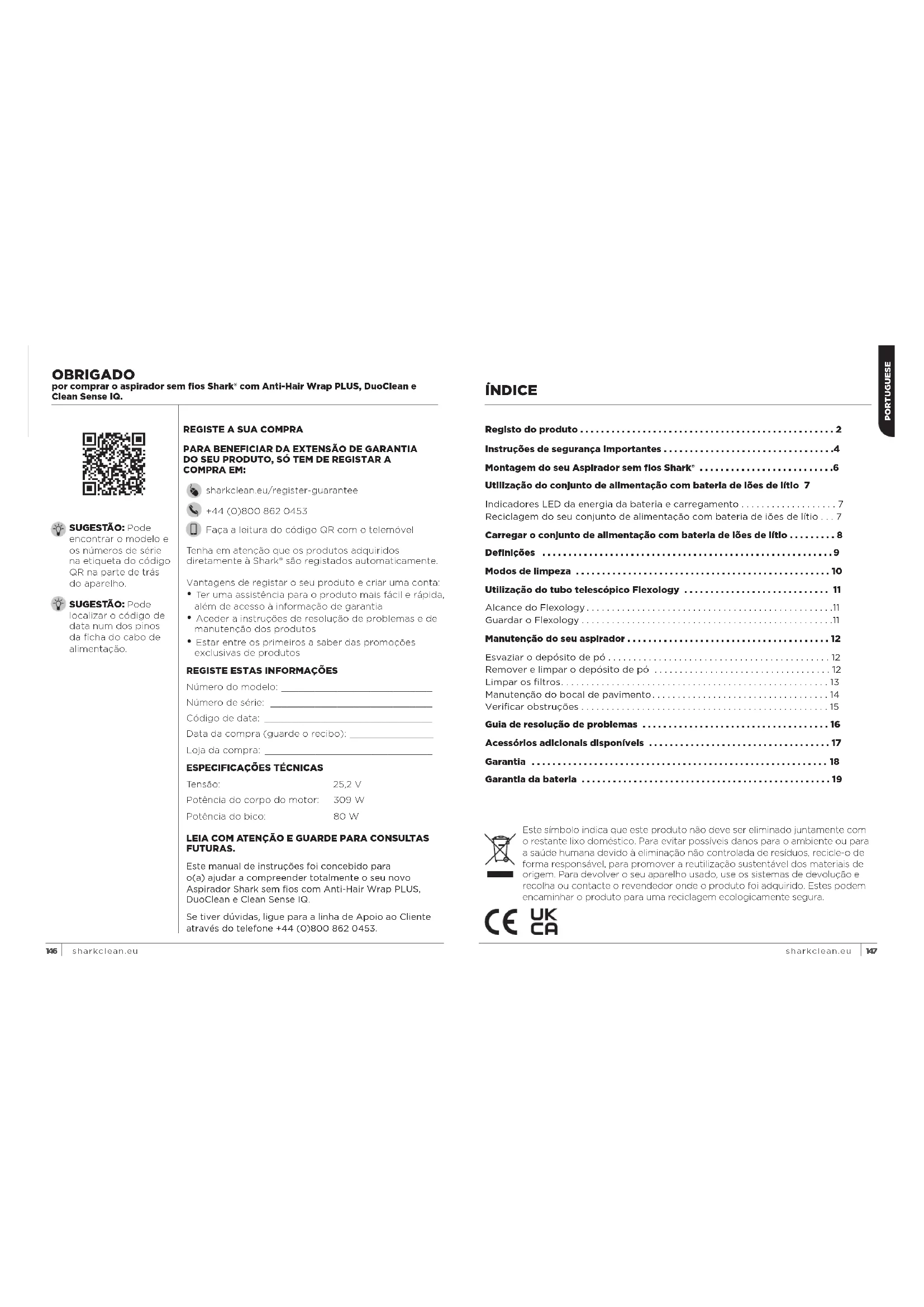 PARA BENEFICIAR DA EXTENSÃO DE GARANTIA DO SEU PRODUTO, SÓ TEM DE REGISTAR A COMPRA EM: sharkclean.eu/register-guarantee +44 (0)800 862 0453 Faça a leitura do código QR com o telemóvel OBRIGADO por comprar o aspirador sem fios Shark® com Anti-Hair Wrap PLUS, DuoClean e Clean Sense IQ. LEIA COM ATENÇÃO E GUARDE PARA CONSULTAS FUTURAS. Este manual de instruções foi concebido para o(a) ajudar a compreender totalmente o seu novo Aspirador Shark sem fios com Anti-Hair Wrap PLUS, DuoClean e Clean Sense IQ Se tiver dúvidas, ligue para a linha de Apoio ao Cliente através do telefone +44 (0)800 862 0453 Vantagens de registar o seu produto e criar uma conta:
