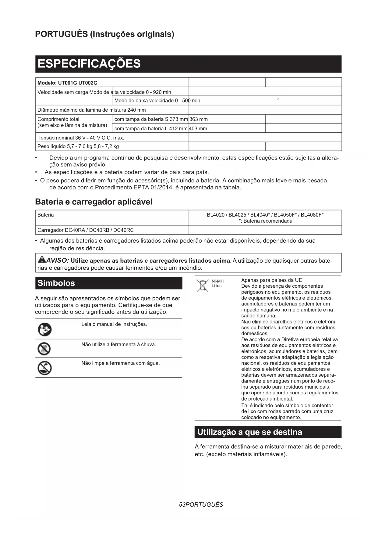 - Algumas das baterias e carregadores listados acima poderão não estar disponíveis, dependendo da sua regiãoderesidência. AVISO: Utilize apenas as baterias e carregadores listados acima. A utilização de quaisquer outras bate- riasecarregadorespodecausarferimentose/ouumincêndio. Símbolos A seguir são apresentados os símbolos que podem ser utilizadosparaoequipamento.Certique-sedeque compreendeoseusignicadoantesdautilização. Leiaomanualdeinstruções. Não utilize a ferramenta à chuva. Não limpe a ferramenta com água. Ni-MH Li-ion Apenas para países da UE Devido à presença de componentes perigosos no equipamento, os resíduos de equipamentos elétricos e eletrónicos, acumuladores e baterias podem ter um impacto negativo no meio ambiente e na saúde humana. Não elimine aparelhos elétricos e eletróni- cosoubateriasjuntamentecomresíduos domésticos! De acordo com a Diretiva europeia relativa aos resíduos de equipamentos elétricos e eletrónicos, acumuladores e baterias, bem como a respetiva adaptação à legislação nacional, os resíduos de equipamentos elétricos e eletrónicos, acumuladores e baterias devem ser armazenados separa- damente e entregues num ponto de reco- lha separado para resíduos municipais, que opere de acordo com os regulamentos de proteção ambiental. Tal é indicado pelo símbolo de contentor de lixo com rodas barrado com uma cruz colocado no equipamento. Utilização a que se destina A ferramenta destina-se a misturar materiais de parede, etc.(excetomateriaisinamáveis).54 PORTUGUÊS Ruído A característica do nível de ruído A determinado de acordo com a EN62841-2-10: Modelo UT001G Nível de pressão acústica (L