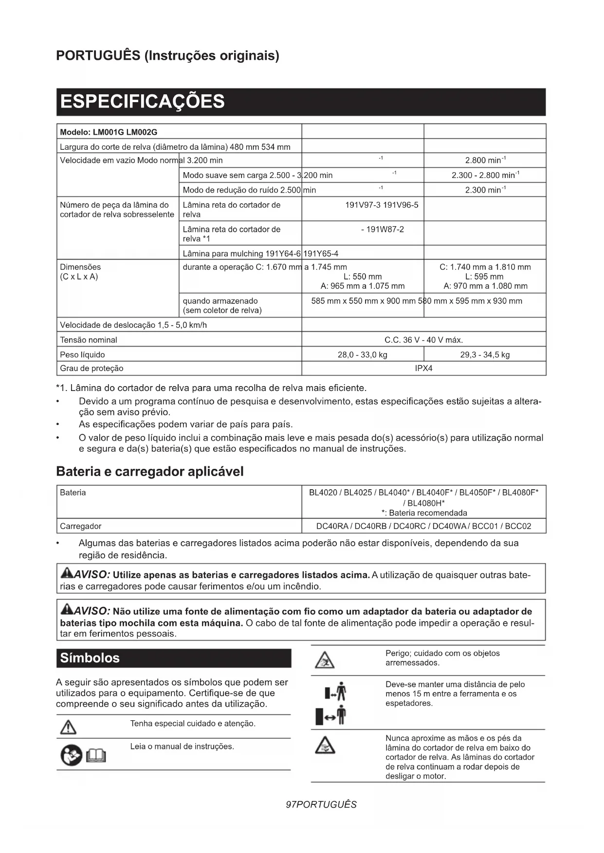 - Algumas das baterias e carregadores listados acima poderão não estar disponíveis, dependendo da sua região de residência. AVISO: Utilize apenas as baterias e carregadores listados acima. A utilização de quaisquer outras bate- rias e carregadores pode causar ferimentos e/ou um incêndio. AVISO: Não utilize uma fonte de alimentação com o como um adaptador da bateria ou adaptador de baterias tipo mochila com esta máquina. O cabo de tal fonte de alimentação pode impedir a operação e resul- tar em ferimentos pessoais. Símbolos A seguir são apresentados os símbolos que podem ser utilizados para o equipamento. Certique-se de que compreende o seu signicado antes da utilização. Tenha especial cuidado e atenção. Leia o manual de instruções. Perigo; cuidado com os objetos arremessados. Deve-se manter uma distância de pelo menos 15 m entre a ferramenta e os espetadores. Nunca aproxime as mãos e os pés da lâmina do cortador de relva em baixo do cortador de relva. As lâminas do cortador de relva continuam a rodar depois de desligar o motor.98 PORTUGUÊS Aviso; desligue a bateria antes da manutenção. Perigo elétrico. O contacto com a água pode causar choque elétrico. Não verta água. Ni-MH Li-ion Apenas para países da UE Devido à presença de componentes perigosos no equipamento, os resíduos de equipamentos elétricos e eletrónicos, acumuladores e baterias podem ter um impacto negativo no meio ambiente e na saúde humana. Não elimine aparelhos elétricos e eletróni- cos ou baterias juntamente com resíduos domésticos! De acordo com a Diretiva europeia relativa aos resíduos de equipamentos elétricos e eletrónicos, acumuladores e baterias, bem como a respetiva adaptação à legislação nacional, os resíduos de equipamentos elétricos e eletrónicos, acumuladores e baterias devem ser armazenados separa- damente e entregues num ponto de reco- lha separado para resíduos municipais, que opere de acordo com os regulamentos de proteção ambiental. Tal é indicado pelo símbolo de contentor de lixo com rodas barrado com uma cruz colocado no equipamento. Nível de potência sonora garantido de acordo com a Diretiva de ruído ambiente da UE. Nível de potência sonora de acordo com o Regulamento de controlo do ruído de NSW da Austrália Utilização a que se destina A máquina serve para cortar a relva. Ruído A característica do nível de ruído A determinado de acordo com a EN62841-4-3: Modelo LM001G Nível medido de potência sonora (L
