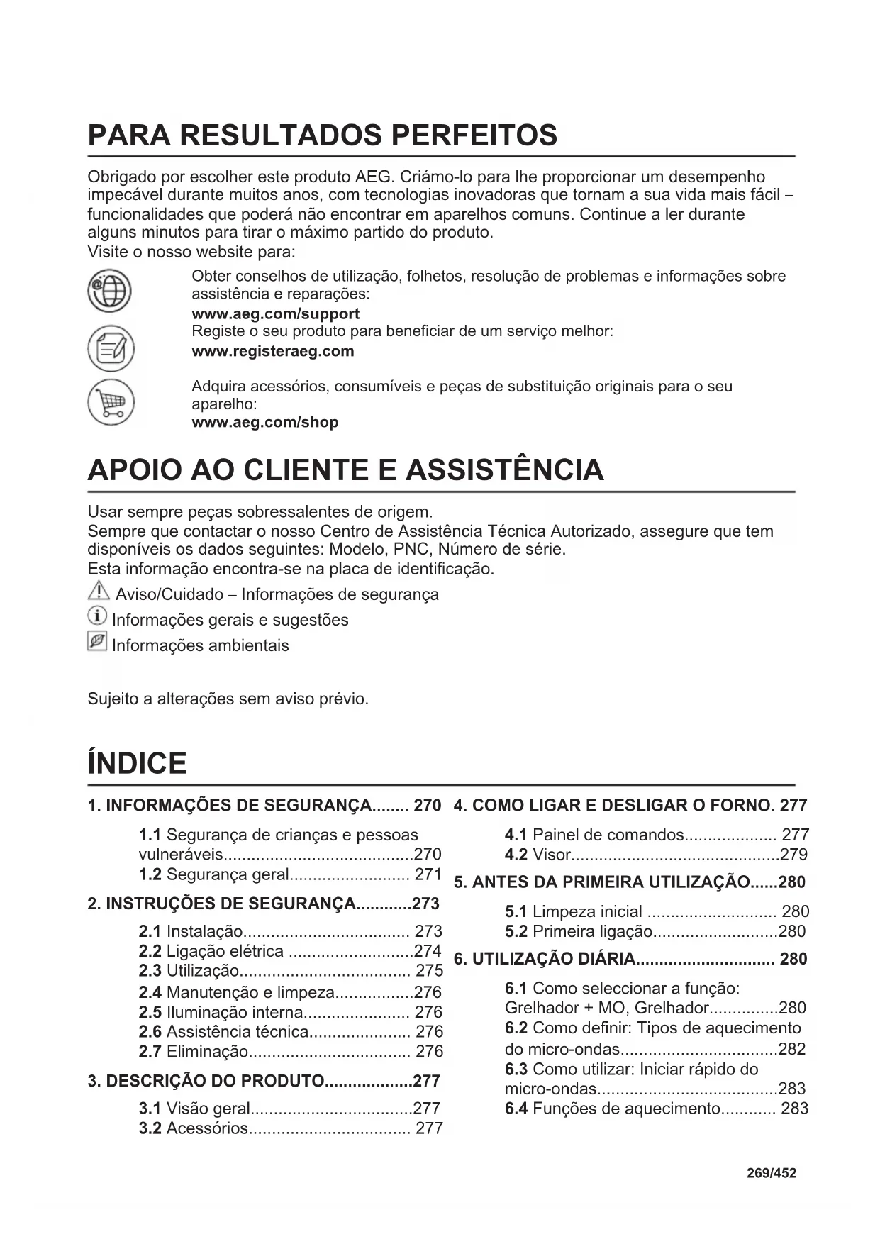Obrigado por escolher este produto AEG. Criámo-lo para lhe proporcionar um desempenho impecável durante muitos anos, com tecnologias inovadoras que tornam a sua vida mais fácil – funcionalidades que poderá não encontrar em aparelhos comuns. Continue a ler durante alguns minutos para tirar o máximo partido do produto. Visite o nosso website para: Obter conselhos de utilização, folhetos, resolução de problemas e informações sobre assistência e reparações: www.aeg.com/support Registe o seu produto para beneficiar de um serviço melhor: www.registeraeg.com Adquira acessórios, consumíveis e peças de substituição originais para o seu aparelho: www.aeg.com/shop