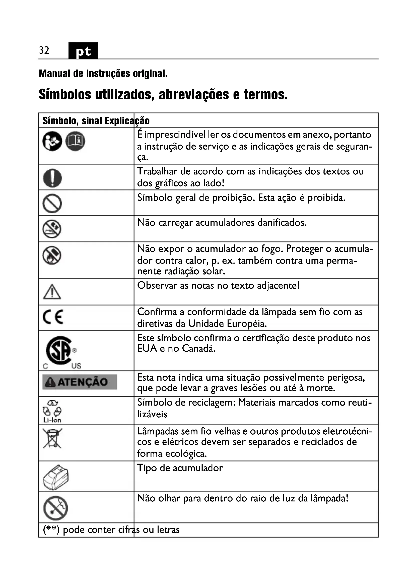 Manual de instruções original. Símbolos utilizados, abreviações e termos. Símbolo, sinal Explicação É imprescindível ler os documentos em anexo, portanto a instrução de serviço e as indicações gerais de seguran- ça. Trabalhar de acordo com as indicações dos textos ou dos gráficos ao lado! Símbolo geral de proibição. Esta ação é proibida. Não carregar acumuladores danificados. Não expor o acumulador ao fogo. Proteger o acumula- dor contra calor, p. ex. também contra uma perma- nente radiação solar. Observar as notas no texto adjacente! Confirma a conformidade da lâmpada sem fio com as diretivas da Unidade Européia. Este símbolo confirma o certificação deste produto nos EUA e no Canadá. Esta nota indica uma situação possivelmente perigosa, que pode levar a graves lesões ou até à morte. Símbolo de reciclagem: Materiais marcados como reuti- lizáveis Lâmpadas sem fio velhas e outros produtos eletrotécni- cos e elétricos devem ser separados e reciclados de forma ecológica. Tipo de acumulador Não olhar para dentro do raio de luz da lâmpada! (**) pode conter cifras ou letras OBJ_BUCH-0000000215-001.book Page 32 Friday, August 7, 2015 9:31 AM33