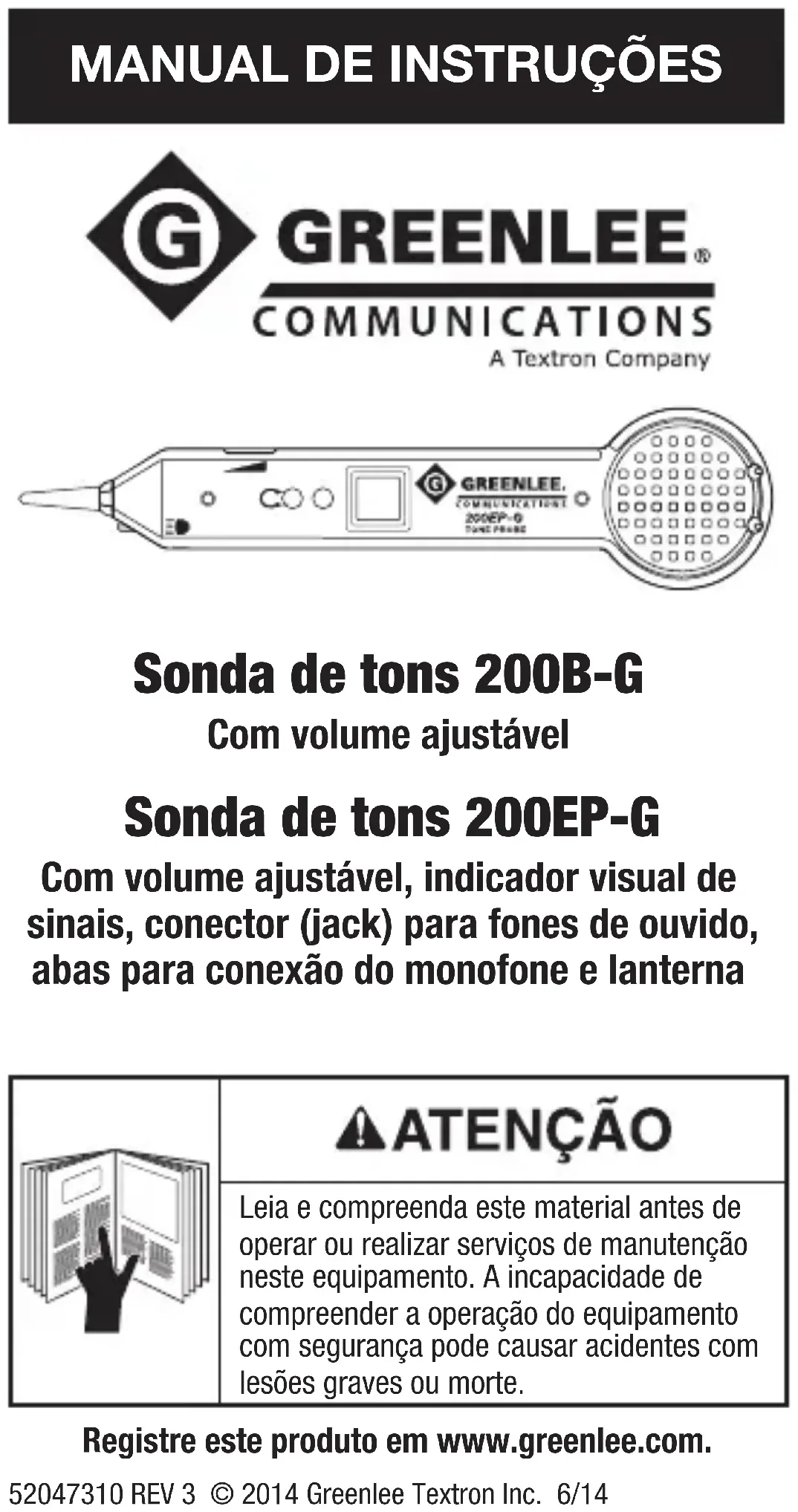 - Somente no 200EP-G Segurança A segurança é essencial no uso e manutenção das ferramentas e equipamentos Greenlee. Este manual de instruções e todas as marcas na ferramenta fornecem informações para se evitarem riscos e práticas inseguras relacionadas com seu uso. Observe todas as informações de segurança fornecidas.45 Finalidade deste manual Este manual de instruções visa familiarizar todos os funcionários com os procedimentos de operação e manutenção seguros das sondas de tons 200B-G e 200EP-G da Greenlee. Mantenha este manual acessível para todos os funcionários. Manuais de reposição encontram-se disponíveis gratuitamente, mediante solicitação, em www.greenlee.com. Operação