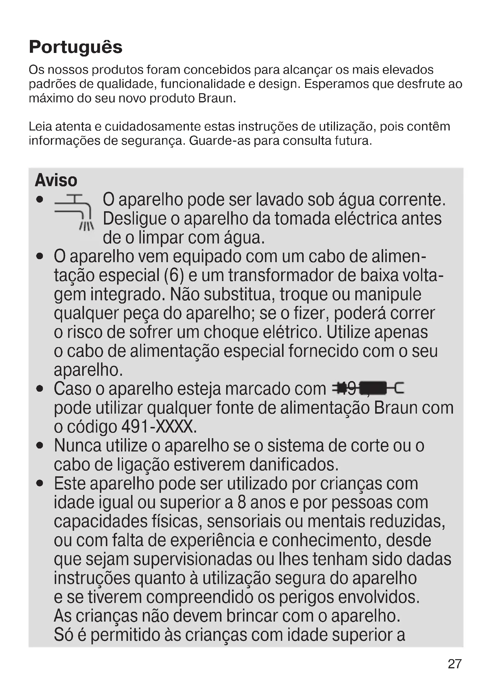 Caso o aparelho esteja marcado com 491, pode utilizar qualquer fonte de alimentação Braun com o código 491-XXXX.