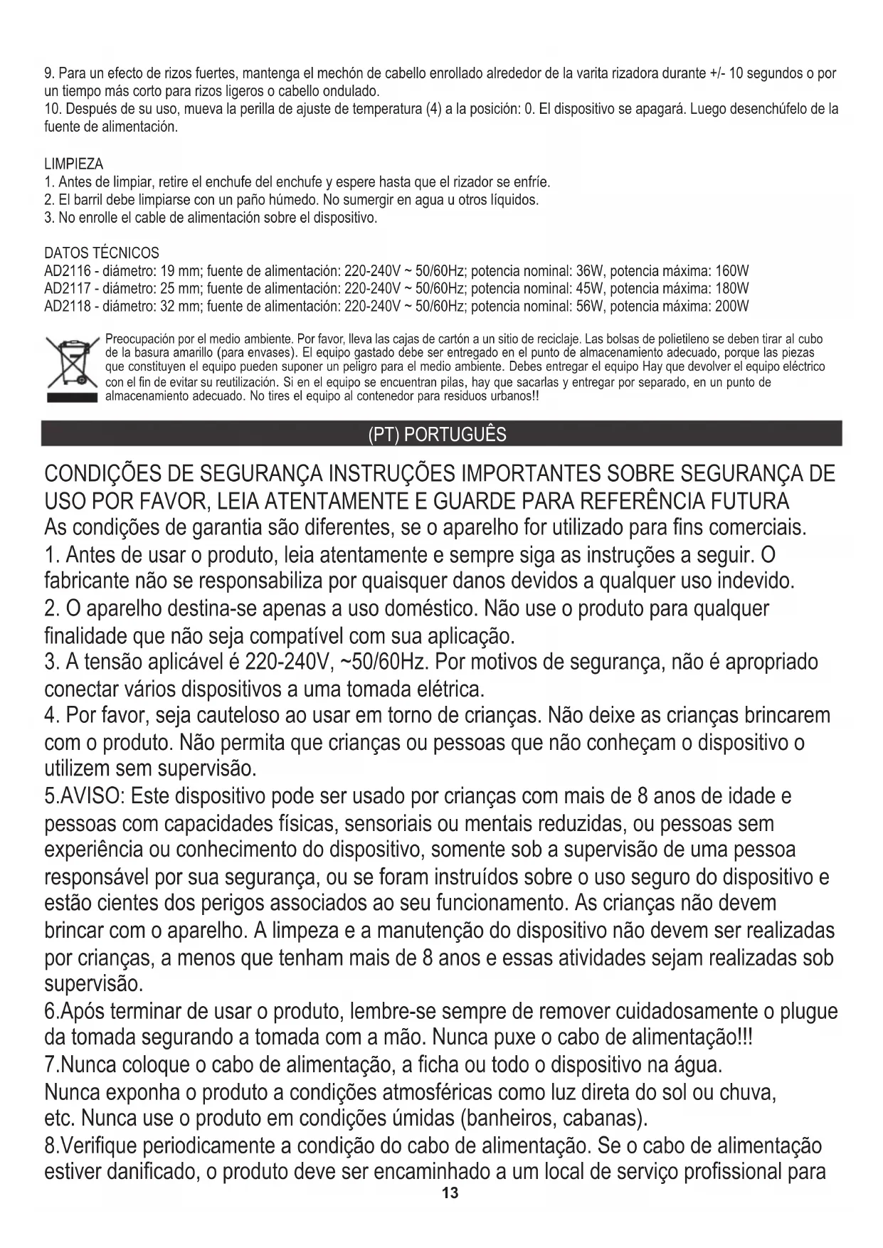 Para obter os melhores resultados na ondulação do cabelo, use um dispositivo em cabelos lavados, escovados e secos. Protecção do meio ambiente. Rogamos, os embalagens de cartão destinem-se para papéis velhos. Os sacos de polietileno (PE) devem-se colocar em contenedores para material plástico. O dispositivo usado deve-se levar a um ponto de armazenamento adequado porque os componentes perigosos que ficam dentro do dispositivo podem ser perigosos para o meio ambiente. O dispositivo elétrico deve-se entregar de modo que se reduza a sua nova utilização e uso. Se no dispositivo há pilhas, devem-se tirar e levar a um ponto de armazenamento em separado. Não colocar o dispositivo em contenedores para resíduos municipais!! (LT) LIETUVIŲ
