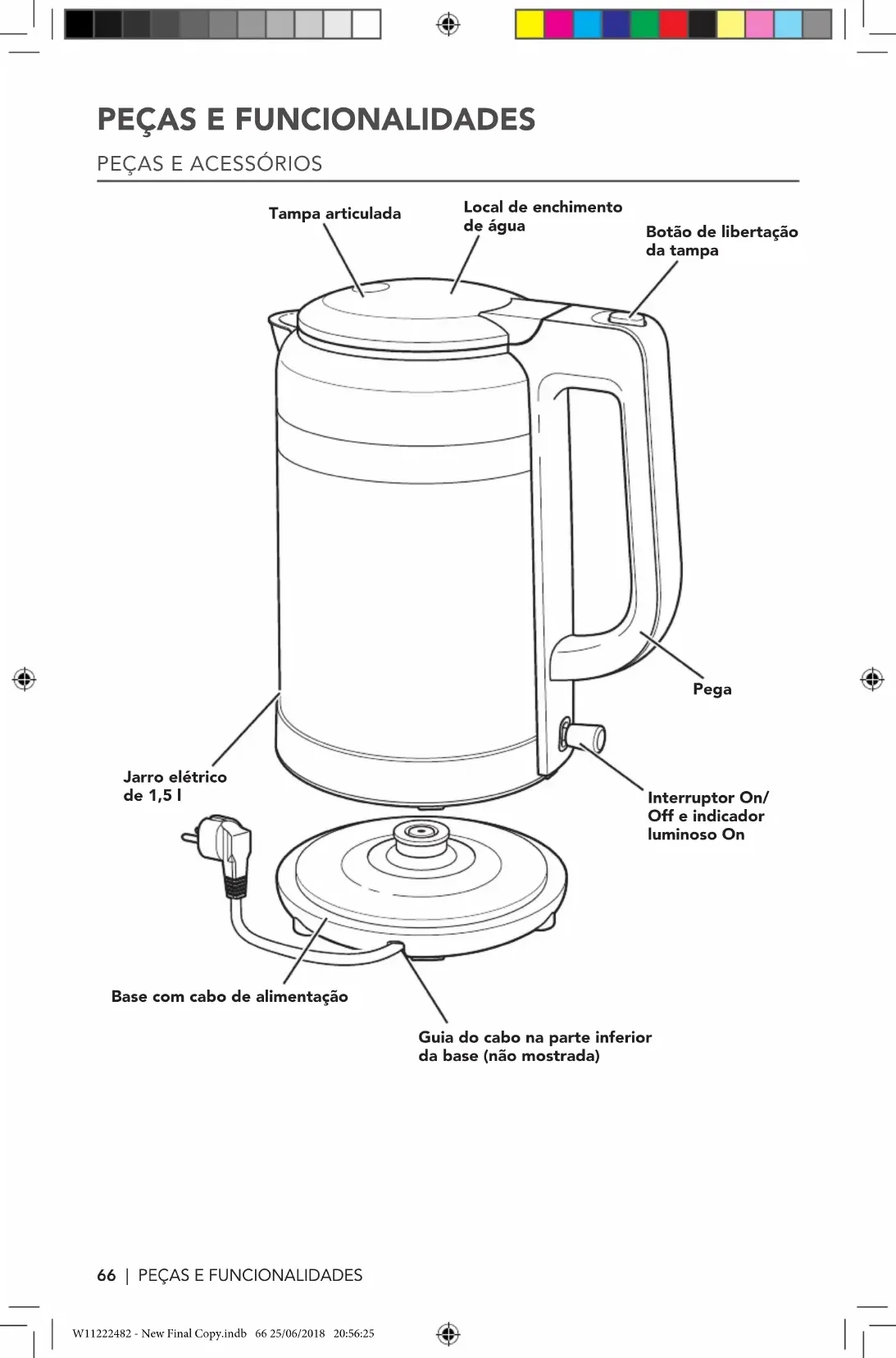 Local de enchimento de água Botão de libertação da tampa Tampa articulada Base com cabo de alimentação Interruptor On/ Off e indicador luminoso On Pega Jarro elétrico de 1,5 l Guia do cabo na parte inferior da base (não mostrada) W11222482 - New Final Copy.indb 66 25/06/2018 20:56:25SEGURANÇA DO JARRO ELÉTRICO | 67 PORTUGUÊS