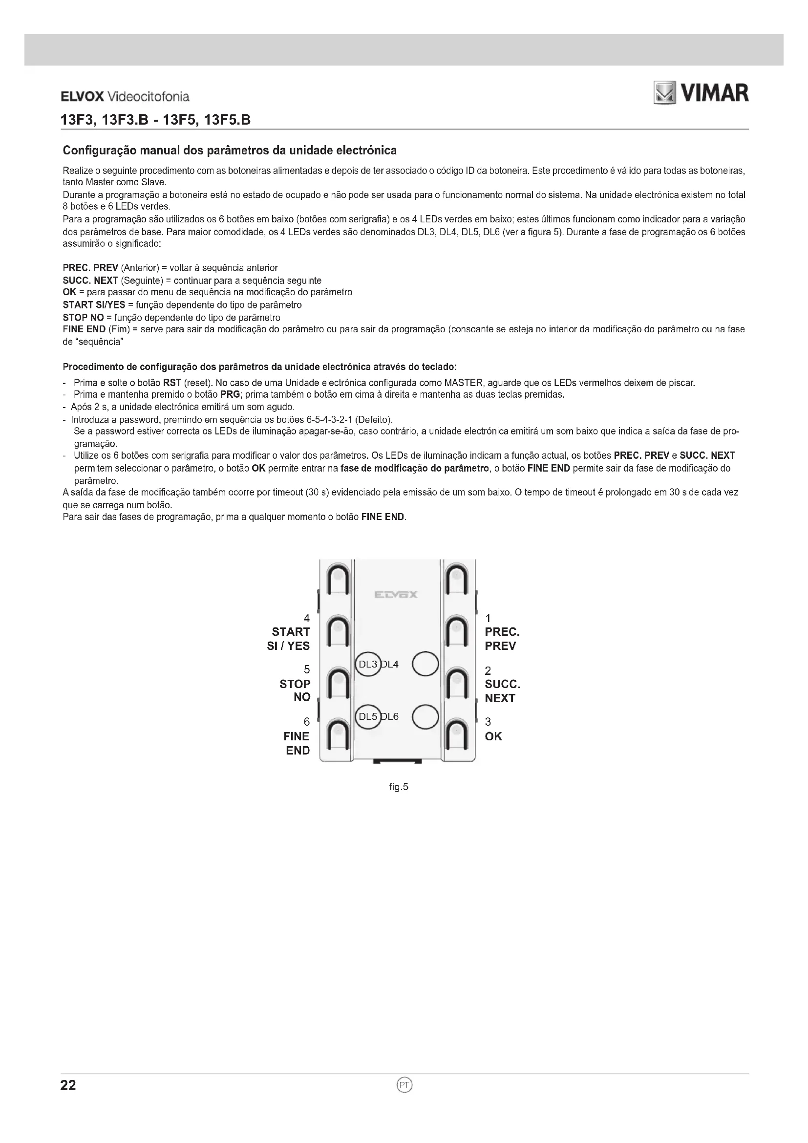 13F3, 13F3.B - 13F5, 13F5.BConfiguração manual dos parâmetros da unidade electrónica Realize o seguinte procedimento com as botoneiras alimentadas e depois de ter associado o código ID da botoneira. Este procedimento é válido para todas as botoneiras, tanto Master como Slave. Durante a programação a botoneira está no estado de ocupado e não pode ser usada para o funcionamento normal do sistema. Na unidade electrónica existem no total 8 botões e 6 LEDs verdes. Para a programação são utilizados os 6 botões em baixo (botões com serigrafia) e os 4 LEDs verdes em baixo; estes últimos funcionam como indicador para a variação dos parâmetros de base. Para maior comodidade, os 4 LEDs verdes são denominados DL3, DL4, DL5, DL6 (ver a figura 5). Durante a fase de programação os 6 botões assumirão o significado: PREC. PREV (Anterior) = voltar à sequência anterior SUCC. NEXT (Seguinte) = continuar para a sequência seguinte OK = para passar do menu de sequência na modificação do parâmetro START SI/YES = função dependente do tipo de parâmetro STOP NO = função dependente do tipo de parâmetro FINE END (Fim) = serve para sair da modificação do parâmetro ou para sair da programação (consoante se esteja no interior da modificação do parâmetro ou na fase de “sequência” Procedimento de configuração dos parâmetros da unidade electrónica através do teclado: - Prima e solte o botão RST (reset). No caso de uma Unidade electrónica configurada como MASTER, aguarde que os LEDs vermelhos deixem de piscar. - Prima e mantenha premido o botão PRG; prima também o botão em cima à direita e mantenha as duas teclas premidas. - Após 2 s, a unidade electrónica emitirá um som agudo. - Introduza a password, premindo em sequência os botões 6-5-4-3-2-1 (Defeito). Se a password estiver correcta os LEDs de iluminação apagar-se-ão, caso contrário, a unidade electrónica emitirá um som baixo que indica a saída da fase de pro