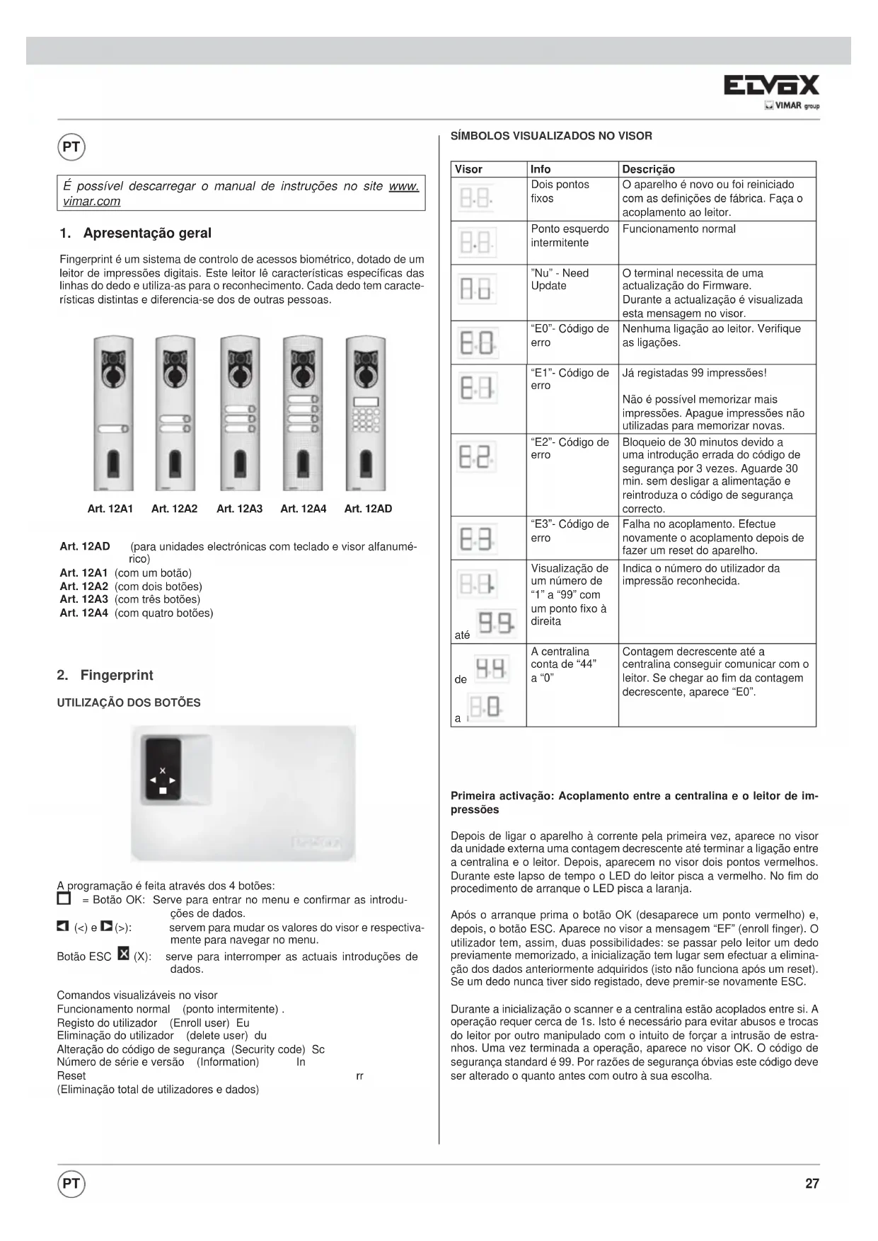 ELVOX 12AD - Sistema de controlo de acesso Vimar - Manual de utilização gratuito