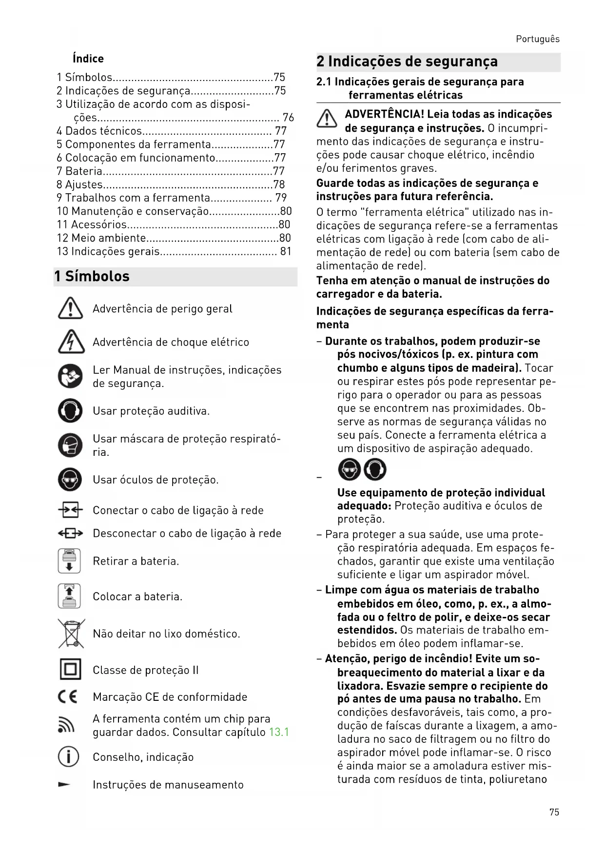 - 13 Indicações gerais 1 Símbolos Advertência de perigo geral Advertência de choque elétrico Ler Manual de instruções, indicações de segurança. Usar proteção auditiva. Usar máscara de proteção respirató ria. Usar óculos de proteção. Conectar o cabo de ligação à rede Desconectar o cabo de ligação à rede Retirar a bateria. Colocar a bateria. Não deitar no lixo doméstico. Classe de proteção II Marcação CE de conformidade A ferramenta contém um chip para guardar dados. Consultar capítulo13.1 Conselho, indicação Instruções de manuseamento 2 Indicações de segurança p. 81