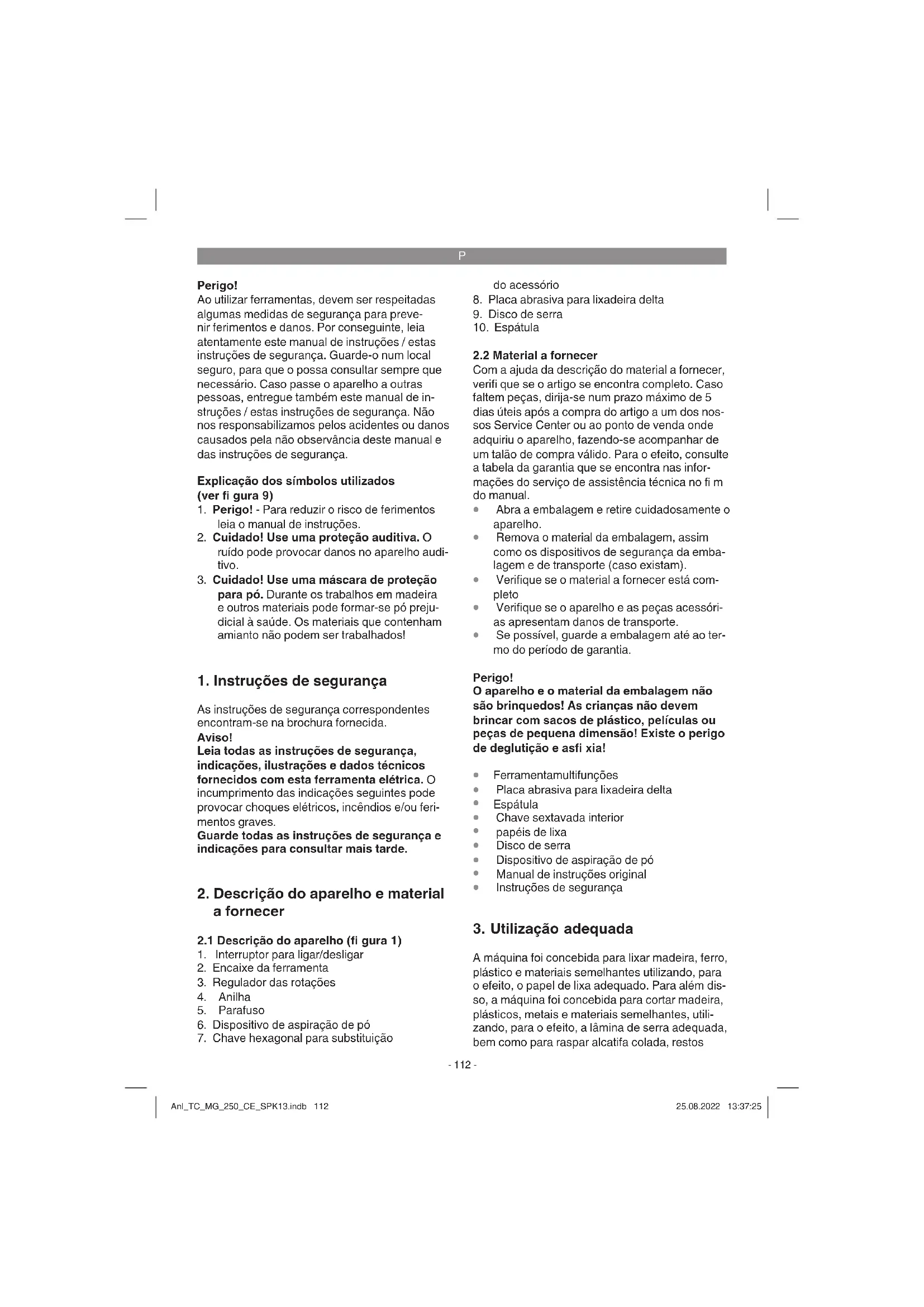 A máquina foi concebida para lixar madeira, ferro, plástico e materiais semelhantes utilizando, para o efeito, o papel de lixa adequado. Para além dis- so, a máquina foi concebida para cortar madeira, plásticos, metais e materiais semelhantes, utili- zando, para o efeito, a lâmina de serra adequada, bem como para raspar alcatifa colada, restos Anl_TC_MG_250_CE_SPK13.indb 112Anl_TC_MG_250_CE_SPK13.indb 112 25.08.2022 13:37:2525.08.2022 13:37:25P