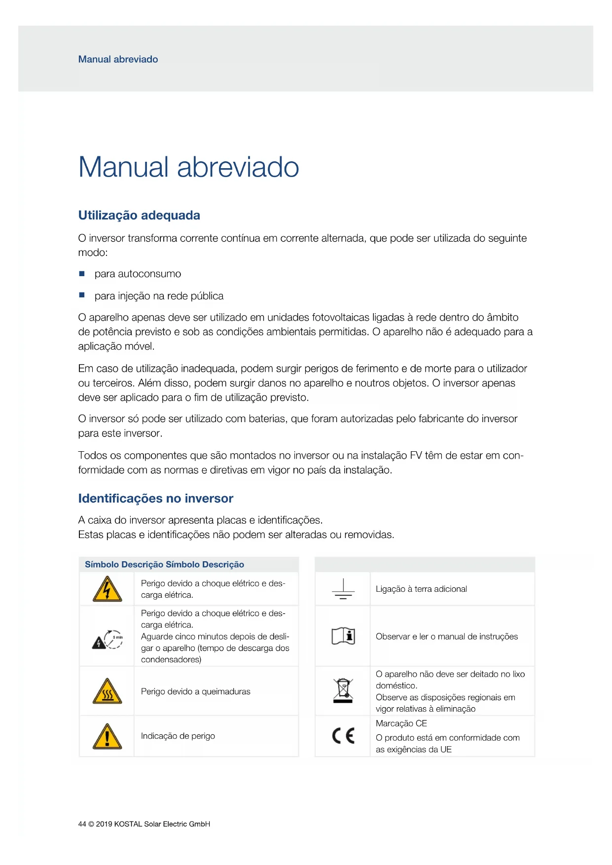 para injeção na rede pública O aparelho apenas deve ser utilizado em unidades fotovoltaicas ligadas à rede dentro do âmbito de potência previsto e sob as condições ambientais permitidas. O aparelho não é adequado para a aplicação móvel. Em caso de utilização inadequada, podem surgir perigos de ferimento e de morte para o utilizador ou terceiros. Além disso, podem surgir danos no aparelho e noutros objetos. O inversor apenas deve ser aplicado para o fim de utilização previsto. O inversor só pode ser utilizado com baterias, que foram autorizadas pelo fabricante do inversor para este inversor. Todos os componentes que são montados no inversor ou na instalação FV têm de estar em con- formidade com as normas e diretivas em vigor no país da instalação. Identificações no inversor A caixa do inversor apresenta placas e identificações. Estas placas e identificações não podem ser alteradas ou removidas. Símbolo Descrição Símbolo Descrição Perigo devido a choque elétrico e des- carga elétrica. Ligação à terra adicional 5 min Perigo devido a choque elétrico e des- carga elétrica. Aguarde cinco minutos depois de desli- gar o aparelho (tempo de descarga dos condensadores) Observar e ler o manual de instruções 5 min Perigo devido a queimaduras O aparelho não deve ser deitado no lixo doméstico. Observe as disposições regionais em vigor relativas à eliminação Indicação de perigo Marcação CE O produto está em conformidade com as exigências da UE© 2019 KOSTAL Solar Electric GmbH 45