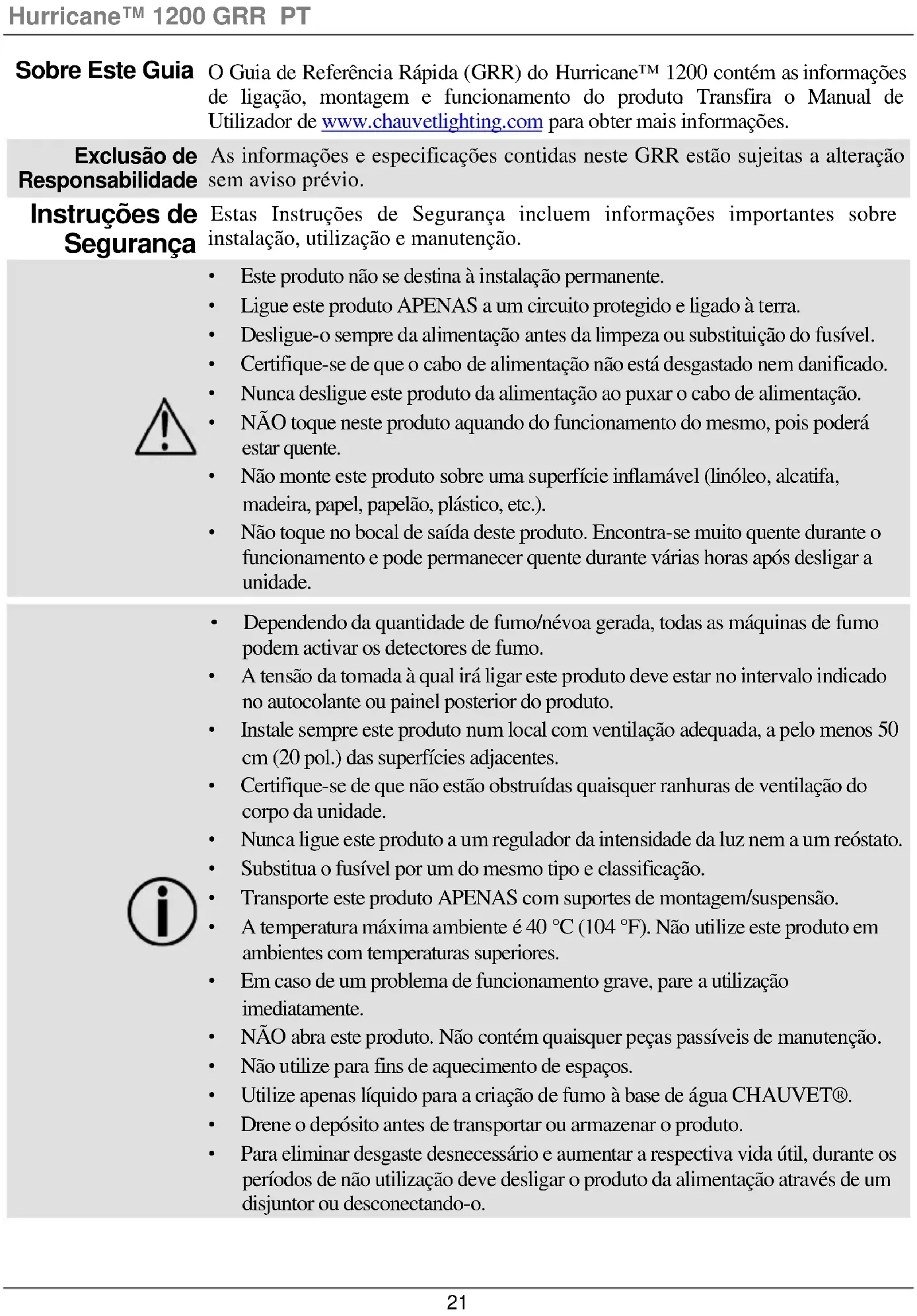 Max. kontinuierlicher Nebel bei Ausstoß 11 20Hurricane™ 1200 GRR PT Sobre Este Guia O Guia de Referência Rápida (GRR) do Hurricane™ 1200 contém as informações de ligação, montagem e funcionamento do produto . Transfira o Manual de Utilizador de www.chauvetlighting.com para obter mais informações. Exclusão de Responsabilidade
