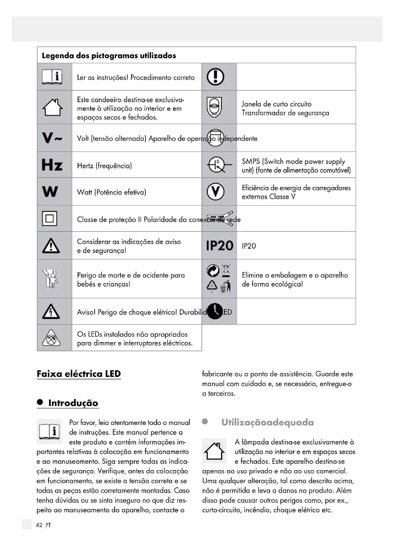 Fitas adesivas Dados técnicos Art.-Nr.: 14125406L / 14125506L Faixa eléctrica LED: Tensão de funcionamento: 100–240 V∼ 50 / 60 Hz Consumo total: 16 W 14125406L: 72 LED, comprimento máx. de 1 m 14125506L: 72 LED, comprimento máx. de 1 m Classe de proteção: II / LED não substituível Segurança Indicações de segurança Em caso de danos causados pela inobservância deste manual de instruções, perde-se o direito à garantia! Não assumimos a responsabilidade por danos subsequentes! Não nos responsabilizamos por danos materiais e pessoais, causados por um manuseamento incorreto ou pela inobservância das indicações de segurança!