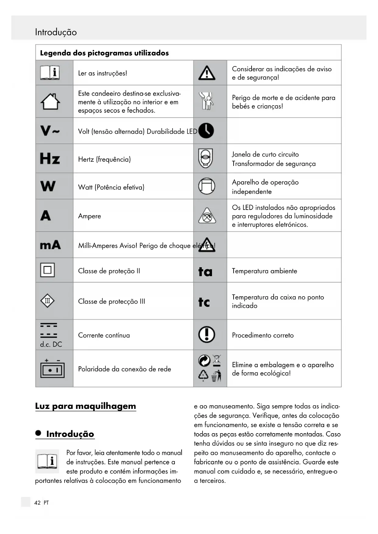 4,8 W DC 24 V, máx. 0,2 A Classe de proteção: II / LED não substituível Segurança Indicações de segurança Em caso de danos causados pela inobservância deste manual de instruções, perde-se o direito à garantia! Não assumimos a responsabilidade por danos subsequentes! Não nos responsabilizamos por danos materiais e pessoais, causados por um manuseamento incorreto ou pela inobservância das indicações de segurança!