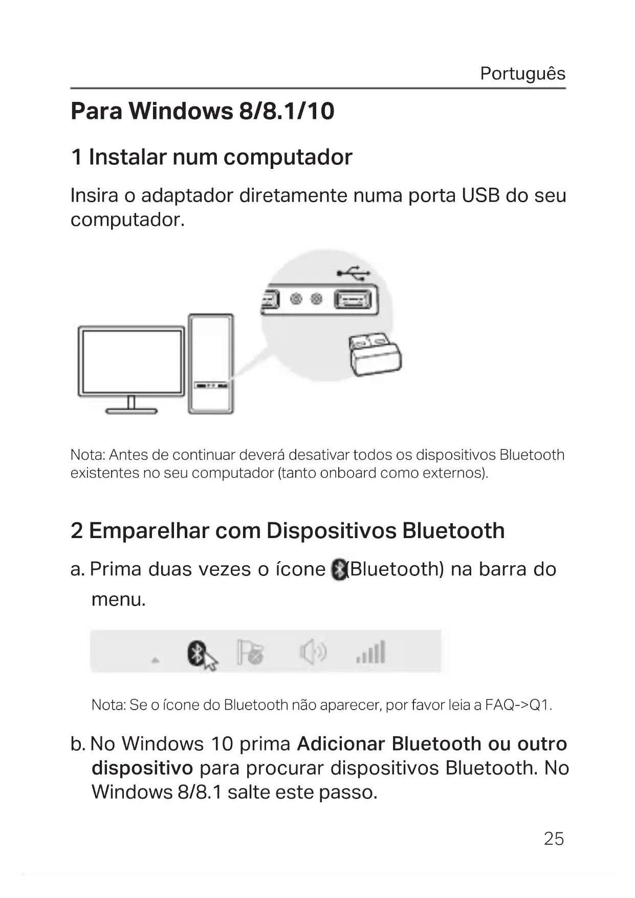 Para Windows 8/8.1/10 1 Instalar num computador Insira o adaptador diretamente numa porta USB do seu computador. Nota: Antes de continuar deverá desativar todos os dispositivos Bluetooth existentes no seu computador (tanto onboard como externos). 2 Emparelhar com Dispositivos Bluetooth a. Prima duas vezes o ícone (Bluetooth) na barra do menu. Nota: Se o ícone do Bluetooth não aparecer, por favor leia a FAQ->Q1. b. No Windows 10 prima Adicionar Bluetooth ou outro dispositivo para procurar dispositivos Bluetooth. No Windows 8/8.1 salte este passo.Português