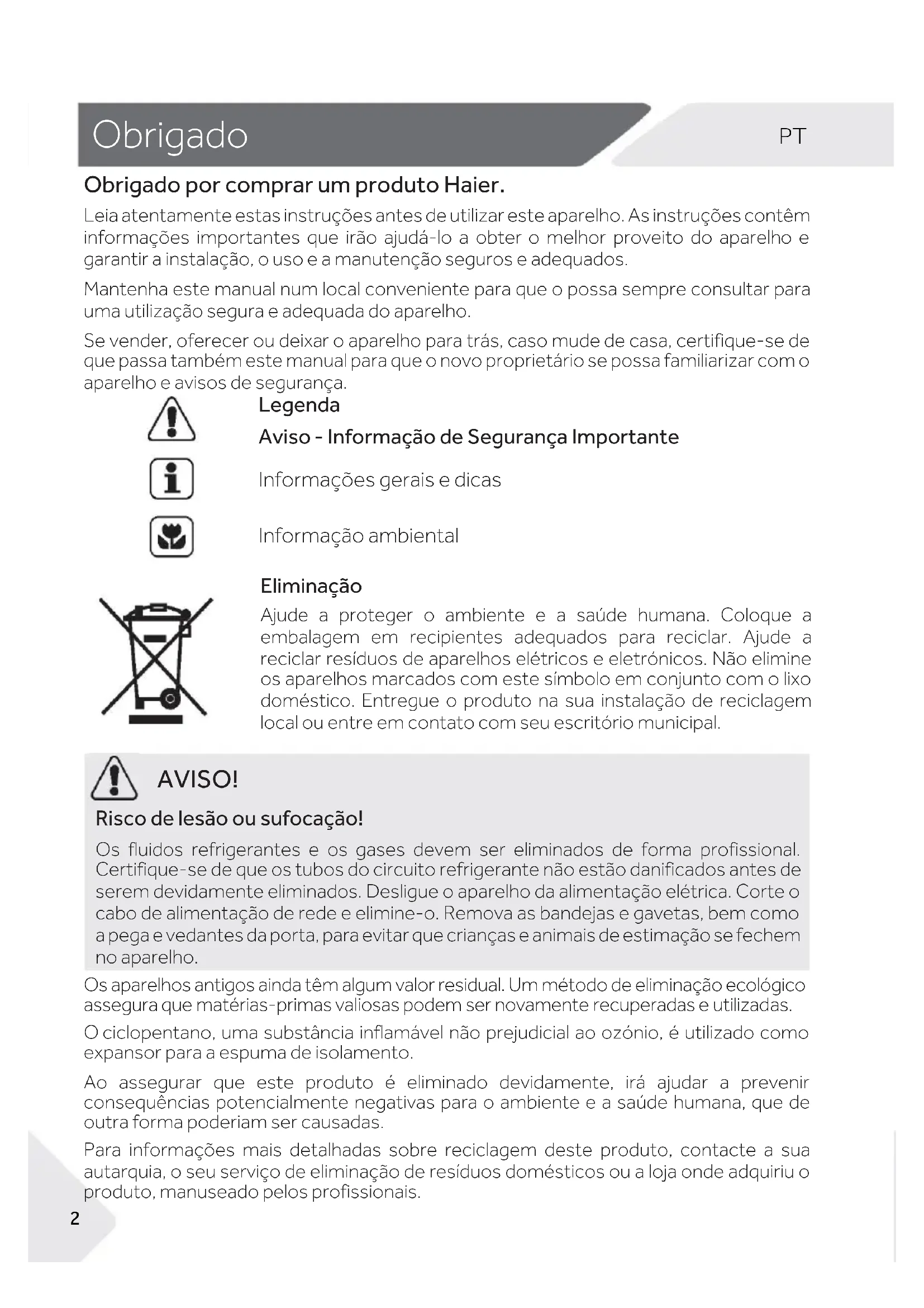 ÎïìðìñäŚǂò O símbolo no produto ou na sua embalagem indica que este produto não pode ser tratado como lixo doméstico. Em vez disso, deve ser entregue no ponto de recolha aplicável para reciclagem de equipamentos elétricos e eletrónicos. Ao assegurar que este produto é elimina do devidamente, irá ajudar a evitar consequências potencialmente negativas para o ambiente e a saúde humana, que de outra forma poderiam ser causadas pelo manuseamento inadequado de resíduos deste produto. Para informações mais detalhadas sobre reciclagem deste produto, entre em contato com departamento da sua cidade, o seu serviço de eliminação de resíduos domésticos ou a loja onde comprou o produto. Uma vez que são utilizados gases de sopro do isolamento inflamáveis, entre em contato com um agente profissional ou nosso serviço pós-venda para eliminar o aparelho. ÊßÒÜØ ÛìöæòçèïèöǂòçèöøéòæäŚǂò Os fluidos refrigerantes e os gases devem ser eliminados de forma profissional. Certifique-se de que os tubos do circuito refrigerante não estão danificados antes de serem devidamente eliminados. Desligue o aparelho da alimentação elétrica. Corte o cabo de alimentação de rede e elimine-o. Remova as bandejas e gavetas, bem como a pega e vedantes da porta, para evitar que crianças e animais de estimação fiquem fechados dentro do aparelho.PT Manutenção