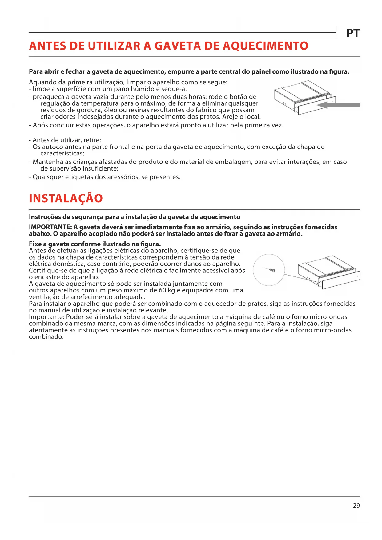 - Antes de utilizar, retire: - Os autocolantes na parte frontal e na porta da gaveta de aquecimento, com exceção da chapa de características; - Mantenha as crianças afastadas do produto e do material de embalagem, para evitar interações, em caso de supervisão insuficiente; - Quaisquer etiquetas dos acessórios, se presentes. INSTALAÇÃO Instruções de segurança para a instalação da gaveta de aquecimento IMPORTANTE: A gaveta deverá ser imediatamente xa ao armário, seguindo as instruções fornecidas abaixo. O aparelho acoplado não poderá ser instalado antes de xar a gaveta ao armário. Fixe a gaveta conforme ilustrado na gura. Antes de efetuar as ligações elétricas do aparelho, certifique-se de que os dados na chapa de características correspondem à tensão da rede elétrica doméstica, caso contrário, poderão ocorrer danos ao aparelho. Certifique-se de que a ligação à rede elétrica é facilmente acessível após o encastre do aparelho. A gaveta de aquecimento só pode ser instalada juntamente com outros aparelhos com um peso máximo de 60 kg e equipados com uma ventilação de arrefecimento adequada. Para instalar o aparelho que poderá ser combinado com o aquecedor de pratos, siga as instruções fornecidas no manual de utilização e instalação relevante. Importante: Poder-se-á instalar sobre a gaveta de aquecimento a máquina de café ou o forno micro-ondas combinado da mesma marca, com as dimensões indicadas na página seguinte. Para a instalação, siga atentamente as instruções presentes nos manuais fornecidos com a máquina de café e o forno micro-ondas combinado.30