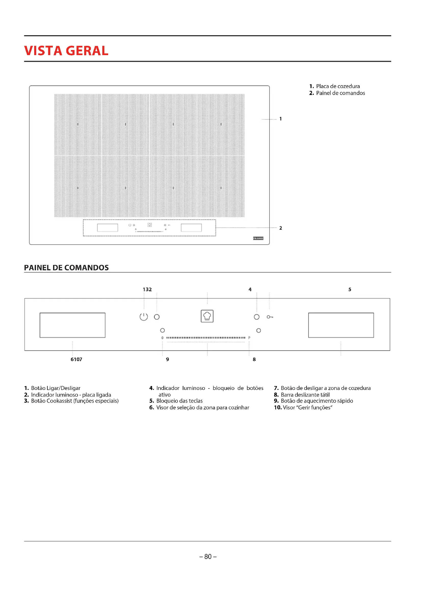 – 75 –– 76 – Antes de utilizar o aparelho, leia estas instruções de segurança com atenção. Guarde-as por perto para consulta futura. Estas instruções e o próprio aparelho possuem mensagens importantes relativas à segurança que deve ler e respeitar sempre. O fabricante declina qualquer responsabilidade pela inobservância das presentes instruções de segurança, pela utilização inadequada do aparelho ou pela incorreta conguração dos controlos. AVISO: Se a superfície estiver quebrada, desligue o aparelho para evitar a possibilidade de choque elétrico. ADVERTÊNCIA: Perigo de incêndio: Não armazene quaisquer produtos nas superfícies de cozedura. CUIDADO: O processo de cozedura tem de ser vigiado. Os processos de cozedura de curta duração devem ser continuamente vigiados. ADVERTÊNCIA: A cozedura de alimentos com gorduras ou óleos numa placa sem vigilância pode ser perigosa - risco de incêndio. NUNCA tente apagar um incêndio com água: desligue o aparelho e depois cubra a chama, por exemplo com uma tampa ou manta antifogo. Não utilize a placa como superfície ou suporte de trabalho. Mantenha quaisquer peças de vestuário ou outros materiais inamáveis afastados do aparelho até que todos os componentes deste tenham arrefecido completamente, pois existe risco de incêndio. Os objetos metálicos, tais como facas, garfos, colheres e tampas não devem ser colocados na superfície da placa, pois podem car quentes. As crianças até aos 3 anos devem ser mantidas afastadas do aparelho. As crianças entre os 3 e os 8 anos devem ser mantidas afastadas do aparelho, exceto se estiverem sob supervisão permanente. Este aparelho pode ser utilizado por crianças a partir dos 8 anos e por pessoas com capacidades físicas, sensoriais ou mentais reduzidas ou com falta de experiência e conhecimento, desde que estejam sob supervisão ou tenham recebido instruções quanto à utilização segura deste aparelho e se compreenderem os perigos envolvidos. As crianças não devem brincar com o aparelho. A limpeza e a manutenção a cargo do utilizador não devem ser realizadas por crianças sem supervisão. Após a utilização, desligue a placa através do respetivo controlo e não cone no detetor de panelas e tachos. ADVERTÊNCIA: Este aparelho e as suas peças acessíveis aquecem durante o uso. Deve ter-se cuidado para evitar tocar nos elementos quentes. Mantenha as crianças com idade inferior a 8 anos afastadas do aparelho a menos que estejam vigiadas em permanência.