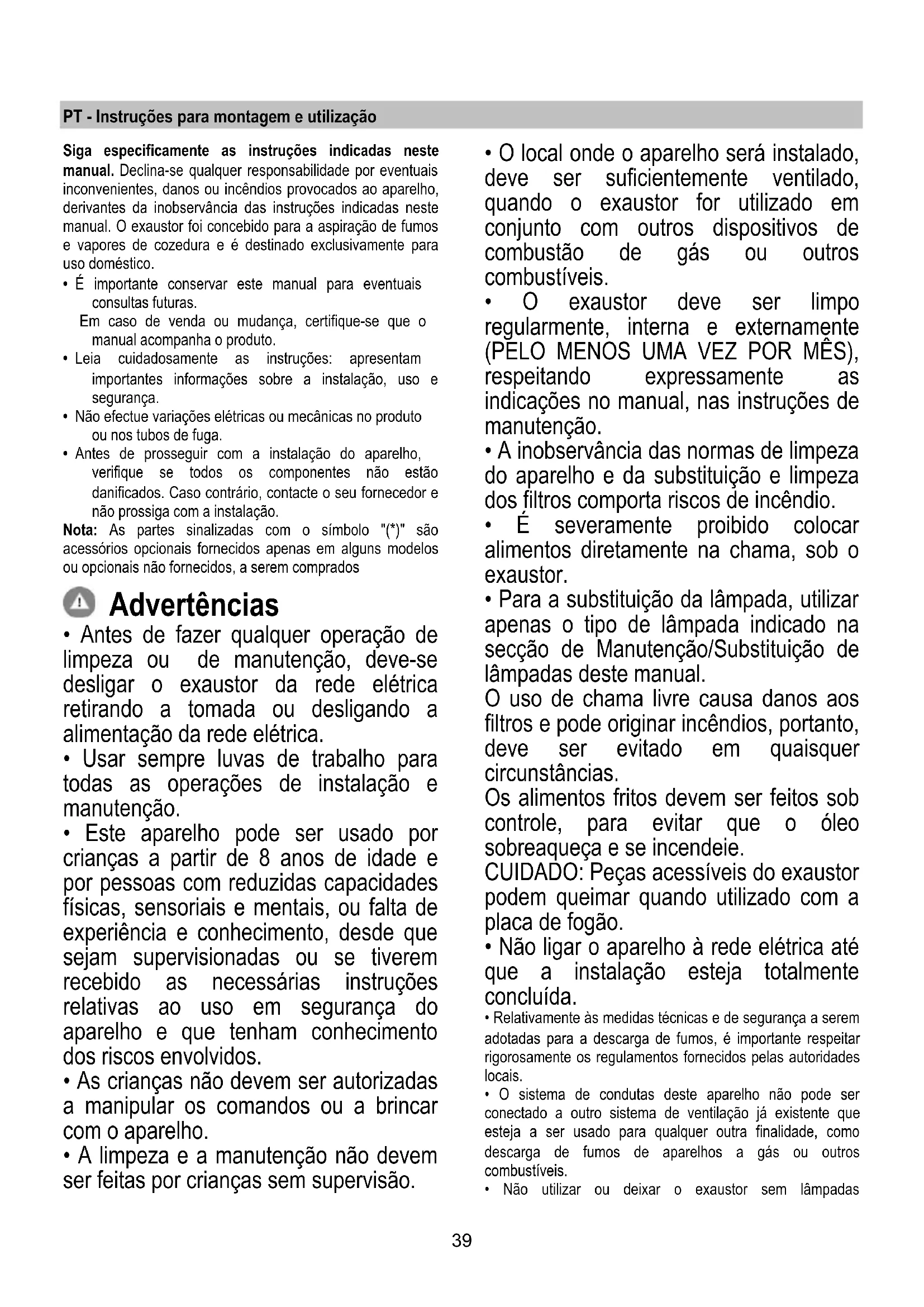 - Para a substituição da lâmpada, utilizar apenas o tipo de lâmpada indicado na secção de Manutenção/Substituição de lâmpadas deste manual. O uso de chama livre causa danos aos filtros e pode originar incêndios, portanto, deve ser evitado em quaisquer circunstâncias. Os alimentos fritos devem ser feitos sob controle, para evitar que o óleo sobreaqueça e se incendeie. CUIDADO: Peças acessíveis do exaustor podem queimar quando utilizado com a placa de fogão.
