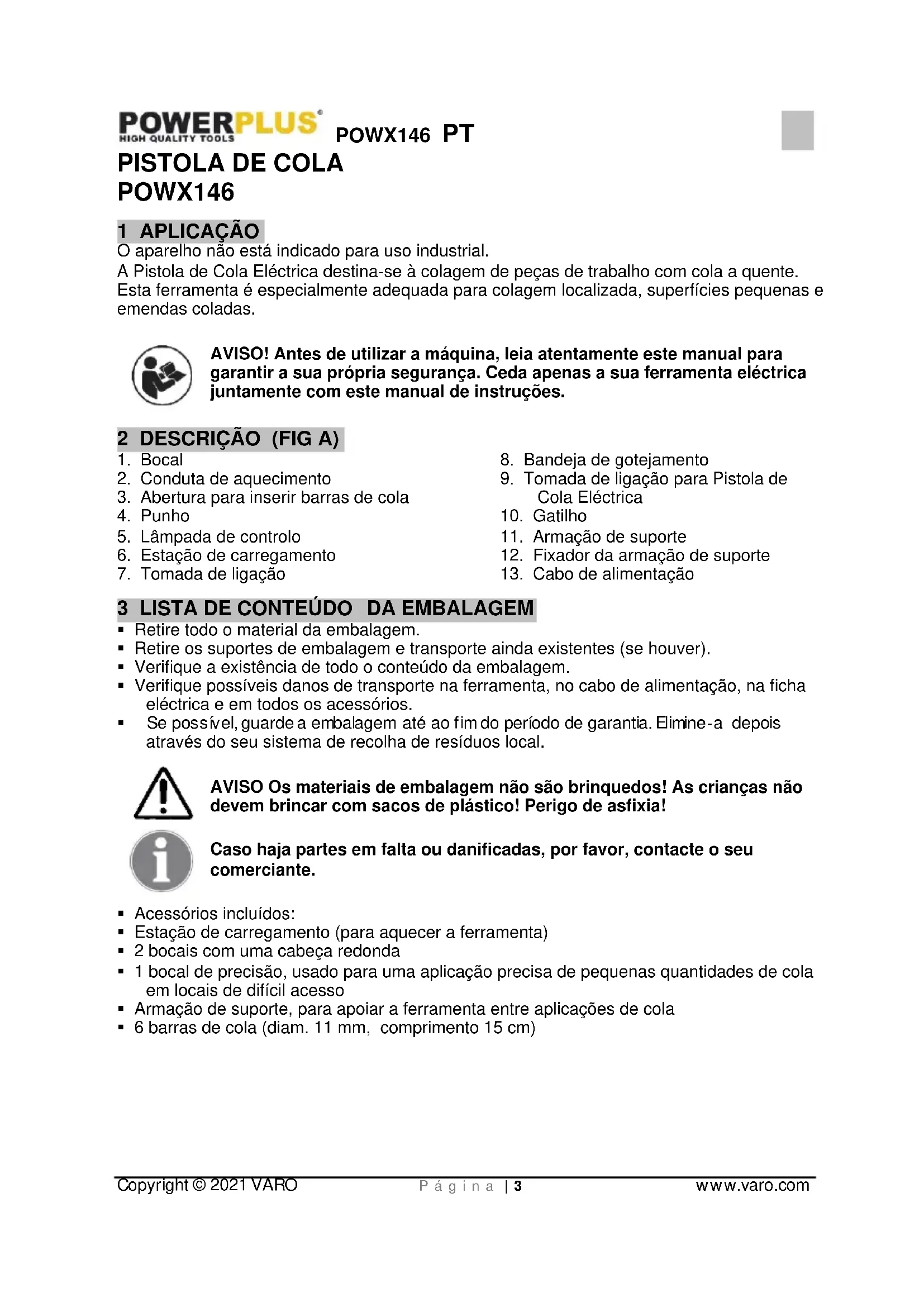 Ferramenta não liga. A ficha não foi inserida na tomada. Insira a ficha na tomada. Cabo de alimentação com defeito. Contacte um departamento de serviço qualificado para substituir o cabo de alimentação A ferramente sobreaquece permita que a ferramenta arrefeça por alguns minutos e de seguida ligue novamente O bocal fica inclinado na rosca O bocal está obstruído. remova o bocal e insira de novo correctamente na rosca do parafuso. Cola a quente não está suficientemente fluida Não suficientemente aquecida. Permita que a ferramenta aqueça por mais tempo. Permita que a ferramenta seja verificada por um departamento de serviço qualificadoPOWX146 PT Copyright © 2021 VARO P á g ina | 10 www.varo.com 14 GARANTIA Este produto tem uma garantia de um período de 36 meses efectivos, a partir da data de aquisição pelo primeiro utilizador. Esta garantia cobre todas as falhas do material ou produção, mas não inclui: baterias, carregadores, peças com defeito por desgaste de utilização normal, como suportes, escovas, cabos e tomadas ou acessórios como brocas, lâminas de serra, etc., danos ou defeitos que sejam resultado de utilização indevida, acidentes ou alterações, nem os custos de transporte. Danos e/ou defeitos resultantes de utilização inadequada também não estão cobertos pelas condições de garantia. Renunciamos também qualquer responsabilidade por quaisquer ferimentos corporais resultantes de utilização inadequada da ferramenta. As reparações apenas devem ser levadas a cabo por um centro de serviço ao cliente autorizado para ferramentas Pow erplus. A qualquer momento pode obter mais informação através do número 00 32 3 292 92 90. Quaisquer custos de transporte devem sempre ser imputados ao cliente, excepto se acordado de outra forma por escrito. Ao mesmo tempo, não pode ser entregue qualquer reivindicação de garantia, se o dano do aparelho resulta de uma manutenção negligente ou de uma sobrecarga. Uma exclusão definitiva da garantia resulta de danos causados por permeação de líquidos, penetração excessiva de poeira, danificação intencional (deliberadamente ou devido à grave falta de cuidados), uso não apropriado (utilização para fins não adequados para este aparelho), utilização não qualificada (p.ex. não respeitando as instruções dadas neste manual), montagem incorrecta, queda de raio, voltagem de rede incorrecta. Esta lista não é restrictiva. Nunca a aceitação de reivindicações de garantia pode levar à prolongamento da garantia ou ao início de um novo período de garantia em caso da substituição do aparelho. Por isso, aparelhos ou componentes substituídos sob garantia ficam na posse de Varo NV. Nós reservamos o direito de rejeitar qualquer reivindicação onde a aquisição não possa ser verificada ou quando é visível que o produto não foi utilizado correctamente. (Limpeza das ranhuras de ventilação, escovas de carvão utilizadas com regularidade, ...) Deverá guardar o seu talão de compra como prova de aquisição do produto. A sua ferramenta desmontada deverá ser devolvida ao representante num estado de limpeza aceitável, na sua caixa de transporte original (aplicável às unidades acompanhadas da prova de compra). 15 MEIO-AMBIENTE Se a sua máquina necessitar de ser substituída após uma utilização prolongada, não a coloque no lixo doméstico. Elimine-a de uma forma ecologicamente segura. O lixo produzido pelas máquinas eléctricas não pode ser eliminado com o lixo doméstico normal. Faça a reciclagem onde existam instalações adequadas. Consulte as autoridades locais ou o seu revendedor para conselhos sobre a recolha e a eliminação.POWX146 PT Copyright © 2021 VARO P á g ina | 11 www.varo.com