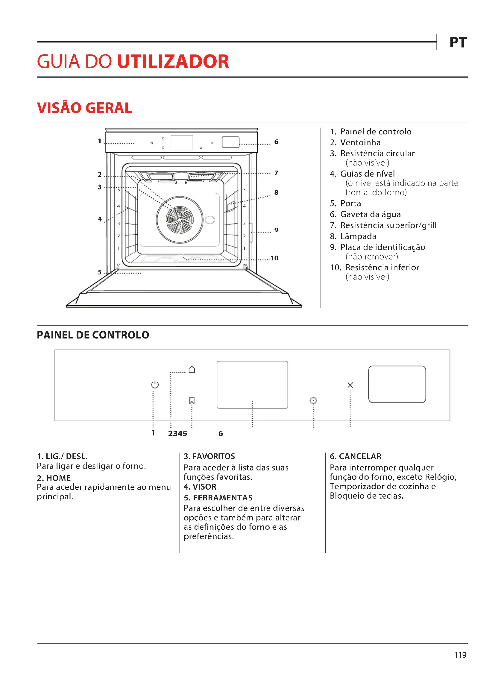 Um forno novo pode libertar odores residuais, resultantes do processo de fabrico: isto é perfeitamente normal Assim, antes de começar a cozinhar alimentos, recomendamos que aqueça o forno, vazio, para eliminar eventuais odores Remova do forno qualquer elemento de proteção em cartão ou película transparente e retire quaisquer acessórios do respetivo interior Aqueça o forno até aos 200 °C durante uma hora, aproximadamente É aconselhável arejar a cozinha após a primeira utilização do aparelho.124