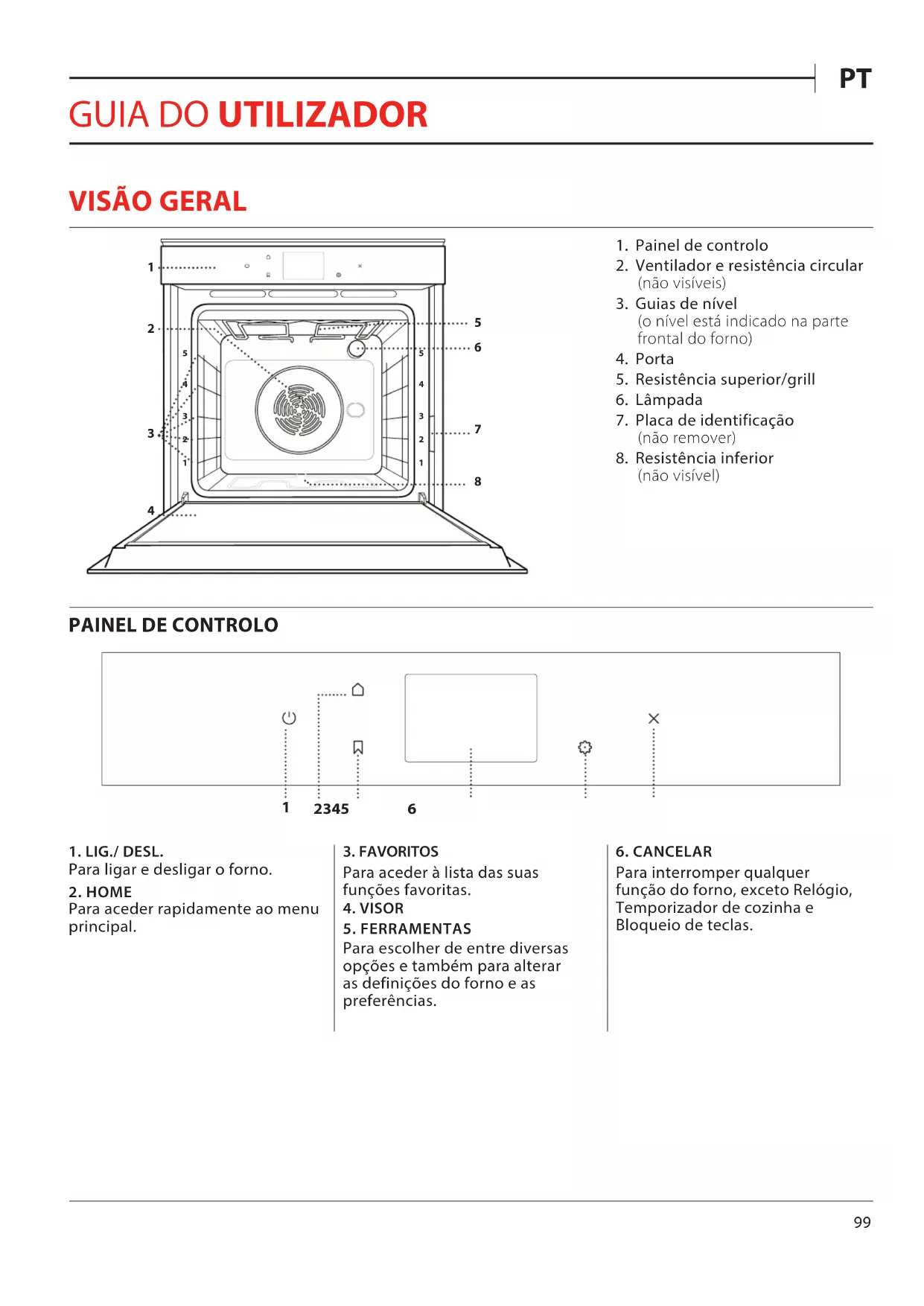 1 Painel de controlo 2 Ventilador e resistência circular (não visíveis) 3 Guias de nível (o nível está indicado na parte frontal do forno) 4 Porta 5 Resistência superior/grill 6 Lâmpada 7 Placa de identificação (não remover) 8 Resistência inferior (não visível)