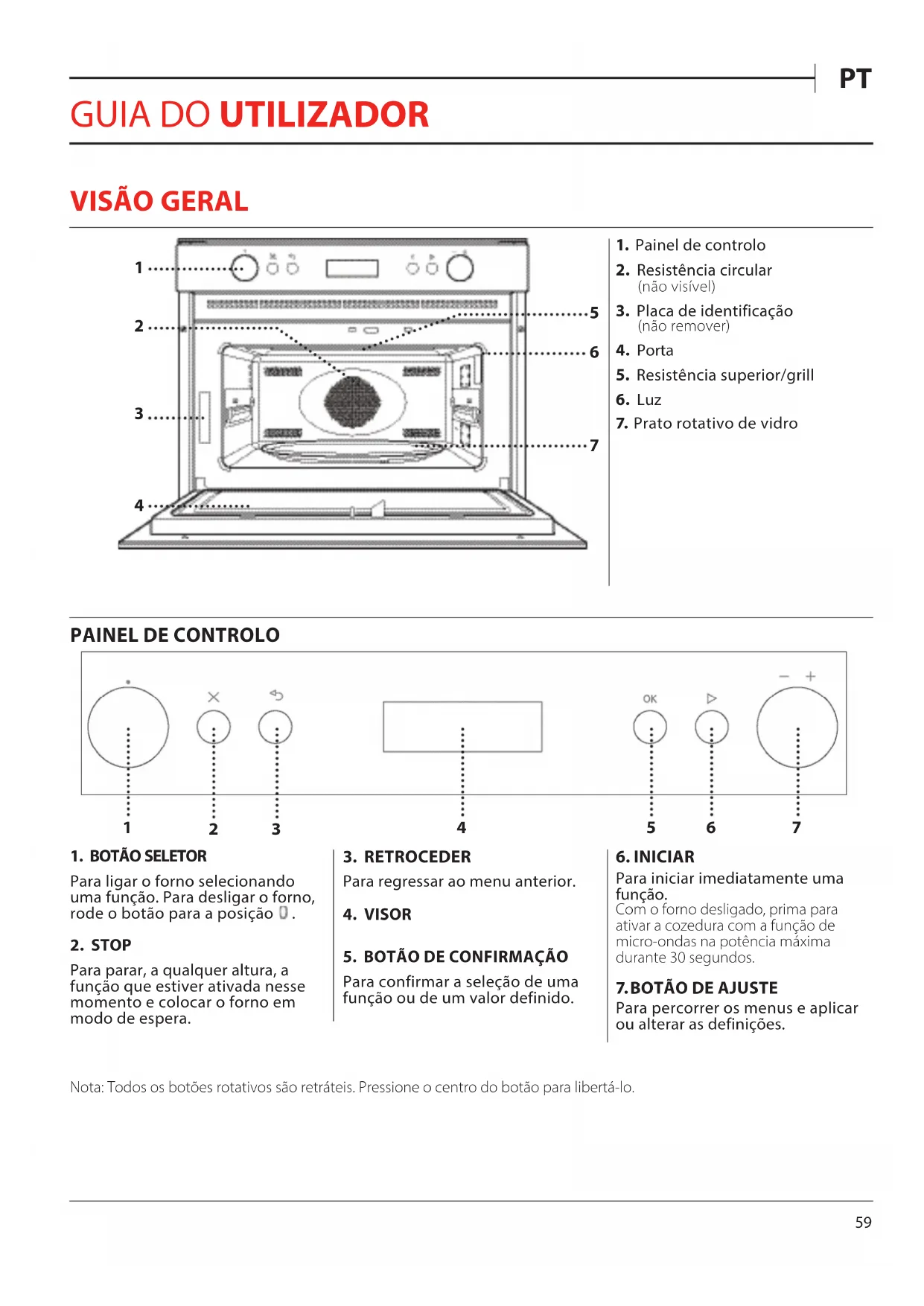 Esta função é ativada automaticamente para evitar que o forno seja ligado inadvertidamente PORTA Abra e feche a porta e, em seguida, prima para iniciar a função .PAUSA Para colocar em pausa uma função ativa, por exemplo, para poder mexer os alimentos ou virá-los, basta abrir a porta Para continuar, feche a porta e prima