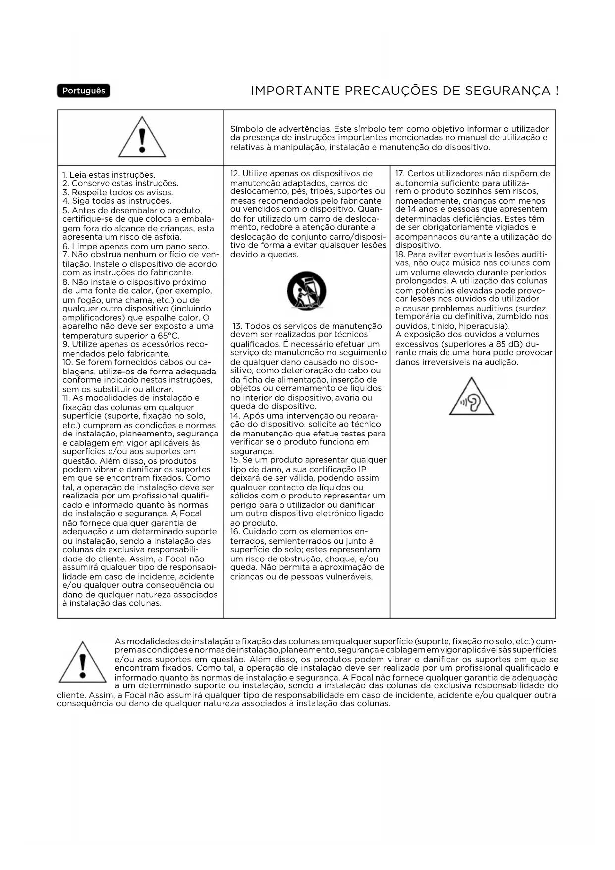 vas, não ouça música nas colunas com um volume elevado durante períodos prolongados. A utilização das colunas com potências elevadas pode provo- car lesões nos ouvidos do utilizador e causar problemas auditivos (surdez temporária ou definitiva, zumbido nos ouvidos, tinido, hiperacusia). A exposição dos ouvidos a volumes excessivos (superiores a 85 dB) du- rante mais de uma hora pode provocar danos irreversíveis na audição. As modalidades de instalação e fixação das colunas em qualquer superfície (suporte, fixação no solo, etc.) cum- prem as condições e normas de instalação, planeamento, segurança e cablagem em vigor aplicáveis às superfícies e/ou aos suportes em questão. Além disso, os produtos podem vibrar e danificar os suportes em que se encontram fixados. Como tal, a operação de instalação deve ser realizada por um profissional qualificado e informado quanto às normas de instalação e segurança. A Focal não fornece qualquer garantia de adequação a um determinado suporte ou instalação, sendo a instalação das colunas da exclusiva responsabilidade do cliente. Assim, a Focal não assumirá qualquer tipo de responsabilidade em caso de incidente, acidente e/ou qualquer outra consequência ou dano de qualquer natureza associados à instalação das colunas.PT