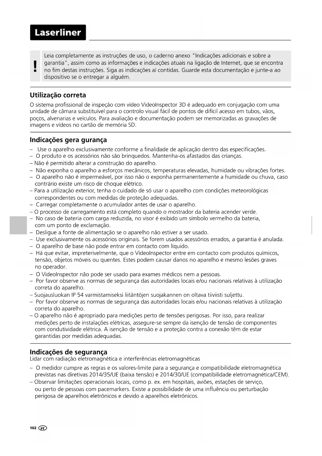 Indicações de segurança Lidar com radiação eletromagnética e interferências eletromagnéticas – O medidor cumpre as regras e os valores-limite para a segurança e compatibilidade eletromagnética previstas nas diretivas 2014/35/UE (baixa tensão) e 2014/30/UE (compatibilidade eletromagnética/CEM). – Observar limitações operacionais locais, como p. ex. em hospitais, aviões, estações de serviço, ou perto de pessoas com pacemarkers. Existe a possibilidade de uma inuência ou perturbação perigosa de aparelhos eletrónicos e devido a aparelhos eletrónicos. Indicações gera gurança – Use o aparelho exclusivamente conforme a nalidade de aplicação dentro das especicações. – O produto e os acessórios não são brinquedos. Mantenha-os afastados das crianças. – Não é permitido alterar a construção do aparelho. – Não exponha o aparelho a esforços mecânicos, temperaturas elevadas, humidade ou vibrações fortes. – O aparelho não é impermeável, por isso não o exponha permanentemente a humidade ou chuva, caso contrário existe um risco de choque elétrico. – Para a utilização exterior, tenha o cuidado de só usar o aparelho com condições meteorológicas correspondentes ou com medidas de proteção adequadas. – Carregar completamente o acumulador antes de usar o aparelho. – O processo de carregamento está completo quando o mostrador da bateria acender verde. – No caso de bateria com carga reduzida, no visor é exibido um símbolo vermelho da bateria, com um ponto de exclamação. – Desligue a fonte de alimentação se o aparelho não estiver a ser usado. – Use exclusivamente os acessórios originais. Se forem usados acessórios errados, a garantia é anulada. – O aparelho de base não pode entrar em contacto com líquido. – Há que evitar, impreterivelmente, que o VideoInspector entre em contacto com produtos químicos, tensão, objetos móveis ou quentes. Estes podem causar danos no aparelho e mesmo lesões graves no operador. – O VideoInspector não pode ser usado para exames médicos nem a pessoas. – Por favor observe as normas de segurança das autoridades locais e/ou nacionais relativas à utilização correta do aparelho. – Suojausluokan IP 54 varmistamiseksi liitäntöjen suojakannen on oltava tiiviisti suljettu. – Por favor observe as normas de segurança das autoridades locais e/ou nacionais relativas à utilização correta do aparelho. – O aparelho não é apropriado para medições perto de tensões perigosas. Por isso, para realizar medições perto de instalações elétricas, assegure-se sempre da isenção de tensão de componentes com condutividade elétrica. A isenção de tensão e a proteção contra a conexão têm de estar garantidas por medidas adequadas.PT VideoInspector 3D