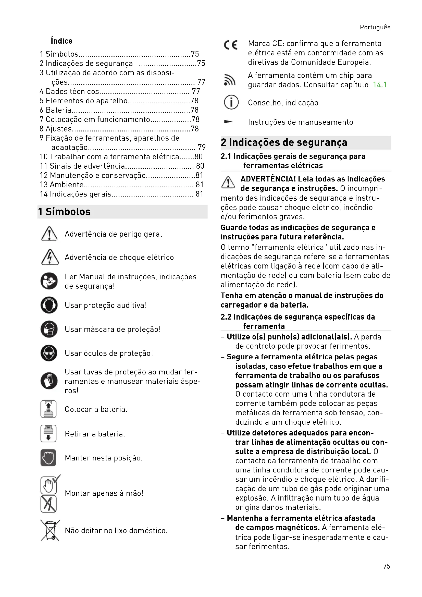 - 14 Indicações gerais 1 Símbolos Advertência de perigo geral Advertência de choque elétrico Ler Manual de instruções, indicações de segurança! Usar proteção auditiva! Usar máscara de proteção! Usar óculos de proteção! Usar luvas de proteção ao mudar fer ramentas e manusear materiais áspe ros! Colocar a bateria. Retirar a bateria. Manter nesta posição. Montar apenas à mão! Não deitar no lixo doméstico. Marca CE: confirma que a ferramenta elétrica está em conformidade com as diretivas da Comunidade Europeia. A ferramenta contém um chip para guardar dados. Consultar capítulo 14.1 Conselho, indicação Instruções de manuseamento 2 Indicações de segurança p. 81