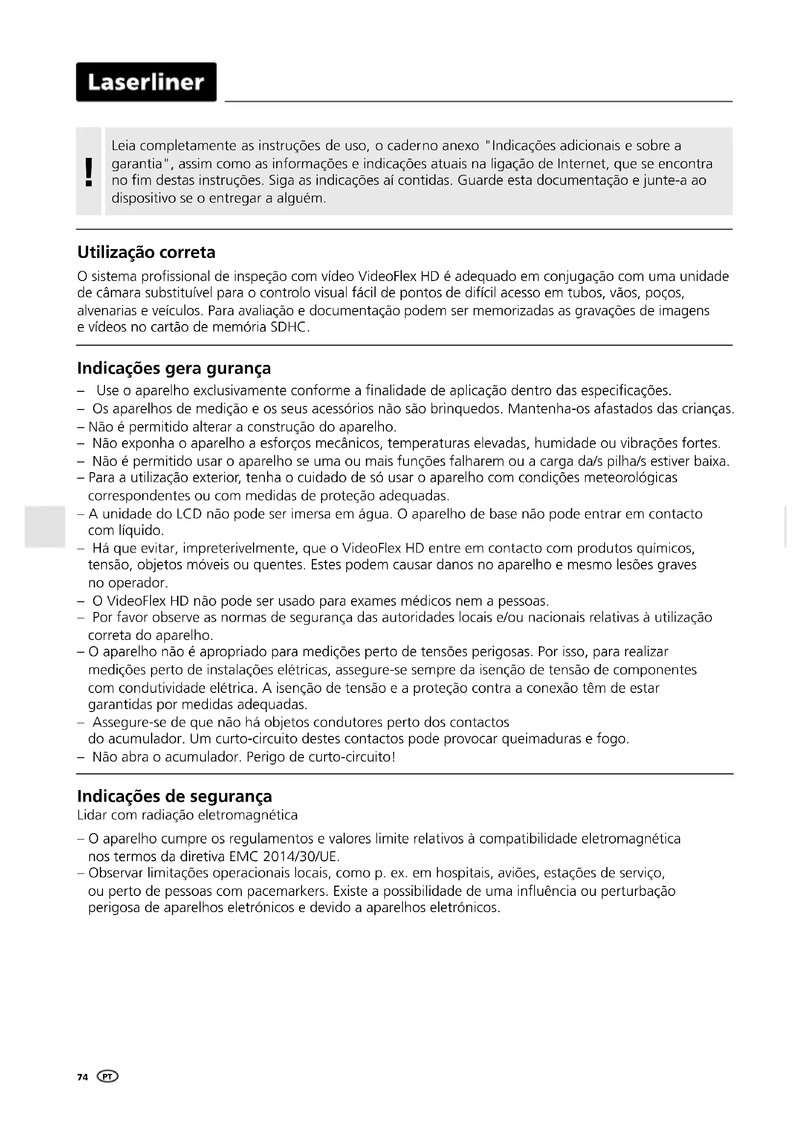 FIIndicações de segurança Lidar com radiação eletromagnética – O aparelho cumpre os regulamentos e valores limite relativos à compatibilidade eletromagnética nos termos da diretiva EMC 2014/30/UE. – Observar limitações operacionais locais, como p. ex. em hospitais, aviões, estações de serviço, ou perto de pessoas com pacemarkers. Existe a possibilidade de uma inuência ou perturbação perigosa de aparelhos eletrónicos e devido a aparelhos eletrónicos. Indicações gera gurança – Use o aparelho exclusivamente conforme a nalidade de aplicação dentro das especicações. – Os aparelhos de medição e os seus acessórios não são brinquedos. Mantenha-os afastados das crianças. – Não é permitido alterar a construção do aparelho. – Não exponha o aparelho a esforços mecânicos, temperaturas elevadas, humidade ou vibrações fortes. – Não é permitido usar o aparelho se uma ou mais funções falharem ou a carga da/s pilha/s estiver baixa. – Para a utilização exterior, tenha o cuidado de só usar o aparelho com condições meteorológicas correspondentes ou com medidas de proteção adequadas. – A unidade do LCD não pode ser imersa em água. O aparelho de base não pode entrar em contacto com líquido. – Há que evitar, impreterivelmente, que o VideoFlex HD entre em contacto com produtos químicos, tensão, objetos móveis ou quentes. Estes podem causar danos no aparelho e mesmo lesões graves no operador. – O VideoFlex HD não pode ser usado para exames médicos nem a pessoas. – Por favor observe as normas de segurança das autoridades locais e/ou nacionais relativas à utilização correta do aparelho. – O aparelho não é apropriado para medições perto de tensões perigosas. Por isso, para realizar medições perto de instalações elétricas, assegure-se sempre da isenção de tensão de componentes com condutividade elétrica. A isenção de tensão e a proteção contra a conexão têm de estar garantidas por medidas adequadas. – Assegure-se de que não há objetos condutores perto dos contactos do acumulador. Um curto-circuito destes contactos pode provocar queimaduras e fogo. – Não abra o acumulador. Perigo de curto-circuito! Utilização correta O sistema prossional de inspeção com vídeo VideoFlex HD é adequado em conjugação com uma unidade de câmara substituível para o controlo visual fácil de pontos de difícil acesso em tubos, vãos, poços, alvenarias e veículos. Para avaliação e documentação podem ser memorizadas as gravações de imagens e vídeos no cartão de memória SDHC. Leia completamente as instruções de uso, o caderno anexo "Indicações adicionais e sobre a garantia", assim como as informações e indicações atuais na ligação de Internet, que se encontra no fim destas instruções. Siga as indicações aí contidas. Guarde esta documentação e junte-a ao dispositivo se o entregar a alguém.